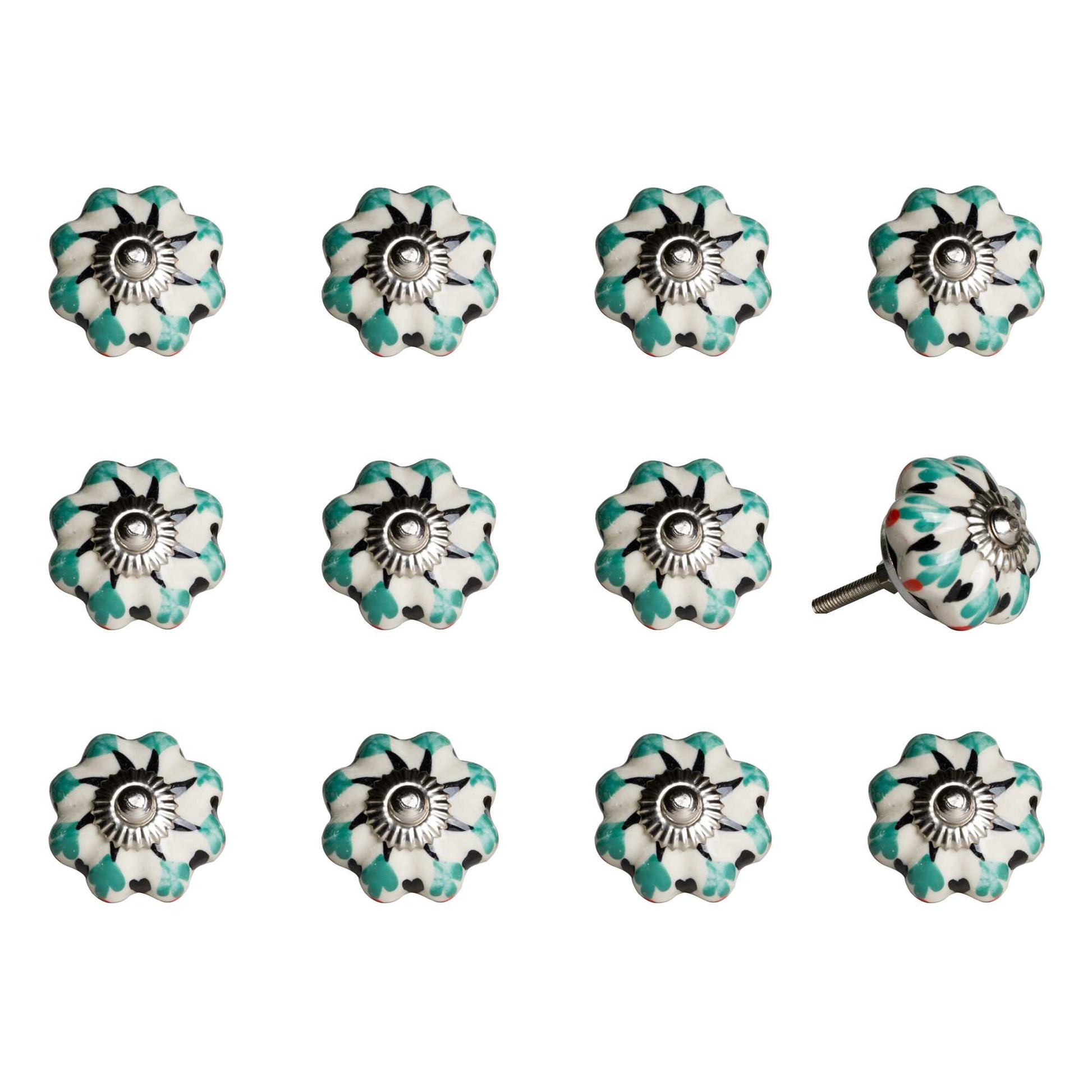 Creatively adorned with bright hues of colors, our 12 pack knobs will suitably accent any furniture in the home. Add a classic touch to your room decor with these ornate pieces that are artfully hand-painted by our skilled artisans. Whether you want them on your doors, drawers, cabinets or wardrobes, these charming knobs are designed to perfectly anchor your living space with an enduring style. Each of these chic knobs comes with a bolt that can be cut to size to fit into any furniture piece, making it highly multi-functional. Available in assorted colors.