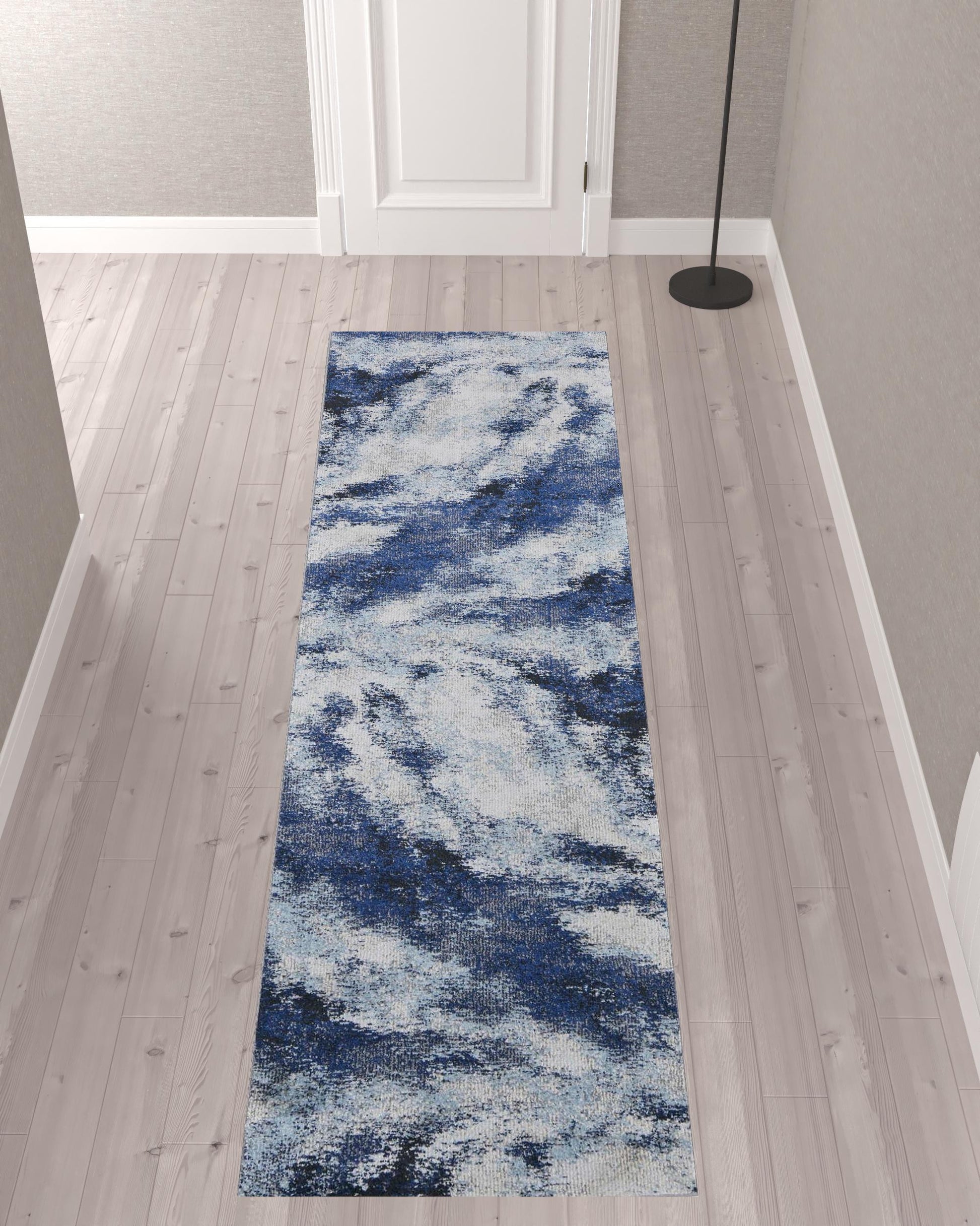 Add great coloration and comfortable texture to your space with this 10' blue and ivory abstract power loom runner rug. This runner shaped rug features a abstract design in blue and ivory to give it visual interest. A classic shape marries with good looking design for your space This superior Turkish rug represents the highest quality and is built to last. Ideal for spaces with kids and pets, this rug is stain resistant to help repel stains and spilled liquids. Place this area rug against a hardwood or tile floor and it will enliven your living space with style and sophistication. 0.39" H x 32" W x 120" D