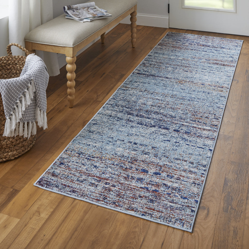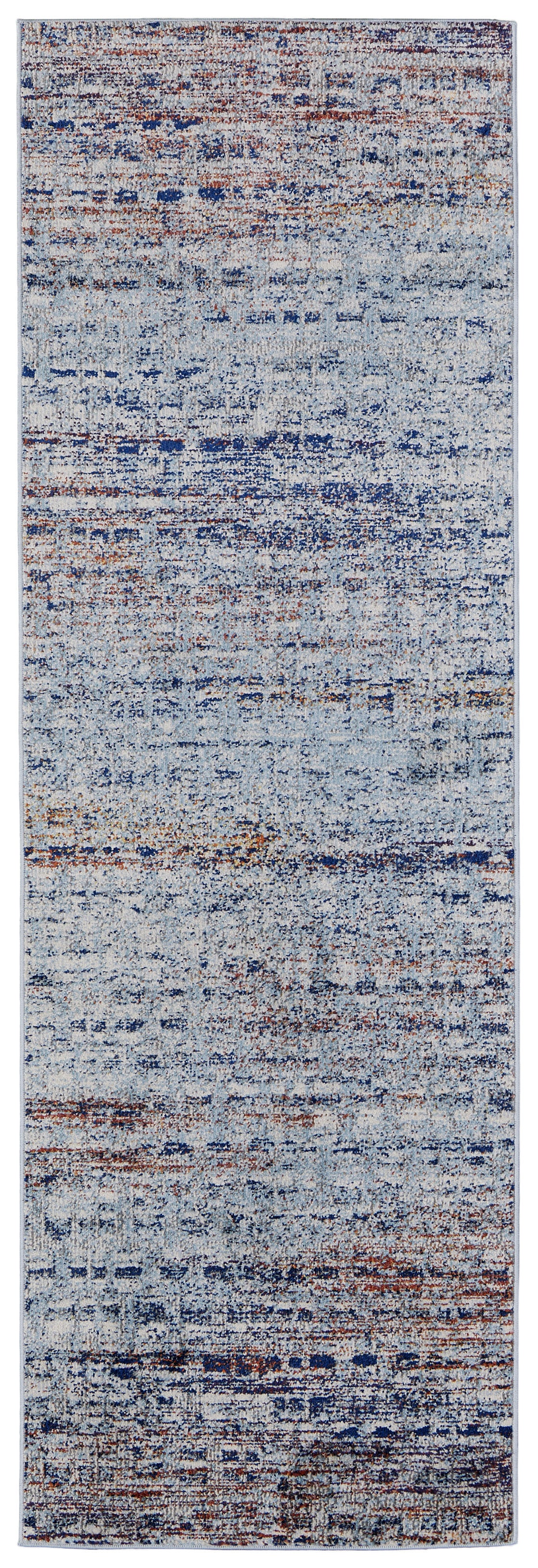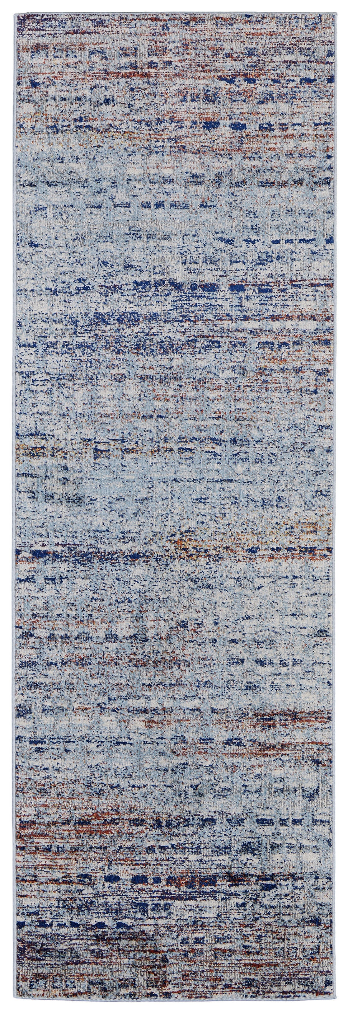 Set an inviting tone in your space with this 10-foot ivory blue and orange abstract power loom runner rug. This runner shaped rug features a abstract design in ivory blue and orange to give it visual interest. A classic shape marries with good looking design for your space ideal for spaces with kids and pets, this rug is stain resistant to help repel stains and spilled liquids. Place this area rug against a hardwood or tile floor and it will enliven your living space with style and sophistication. 32-inch H x 120-inch W x 0.39-inch D