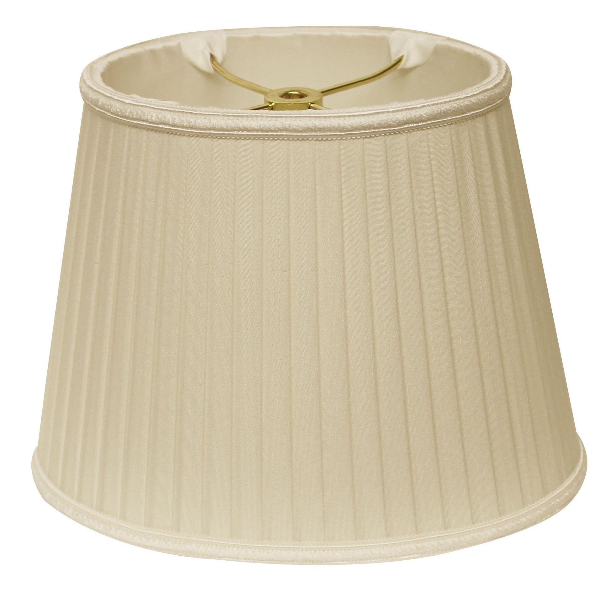 This 10" Ivory Oval Side Pleat Paperback Shantung Lampshade has a hint of traditional flair and will be a great addition to your lamp base. This oval side pleat paperback lampshade includes a washer fitter that fits over a standard harp and can be used with your existing finial design. This high quality crafted oval shape has a slight slant to give it some visual interest and is crafted of the finest shantung with a fold on top and bottom of the shade. 8" x 10" x 7"