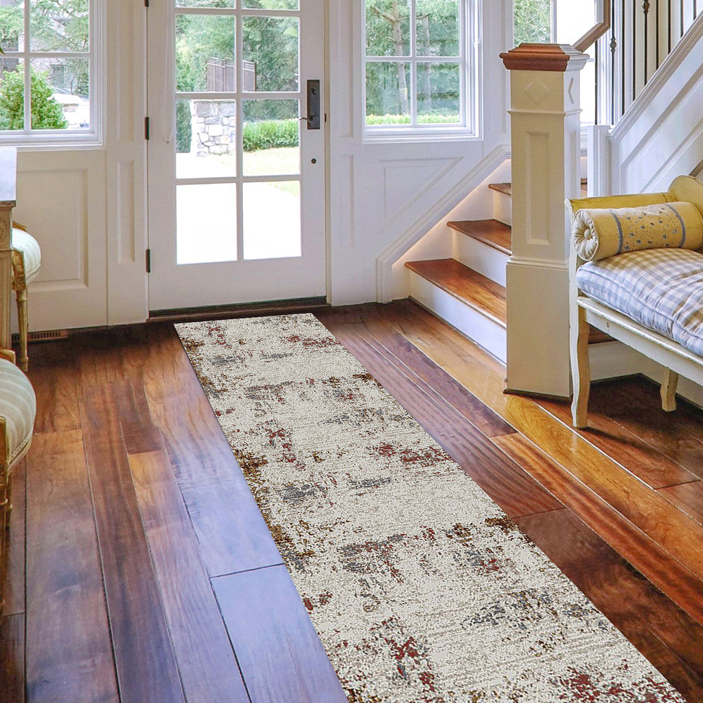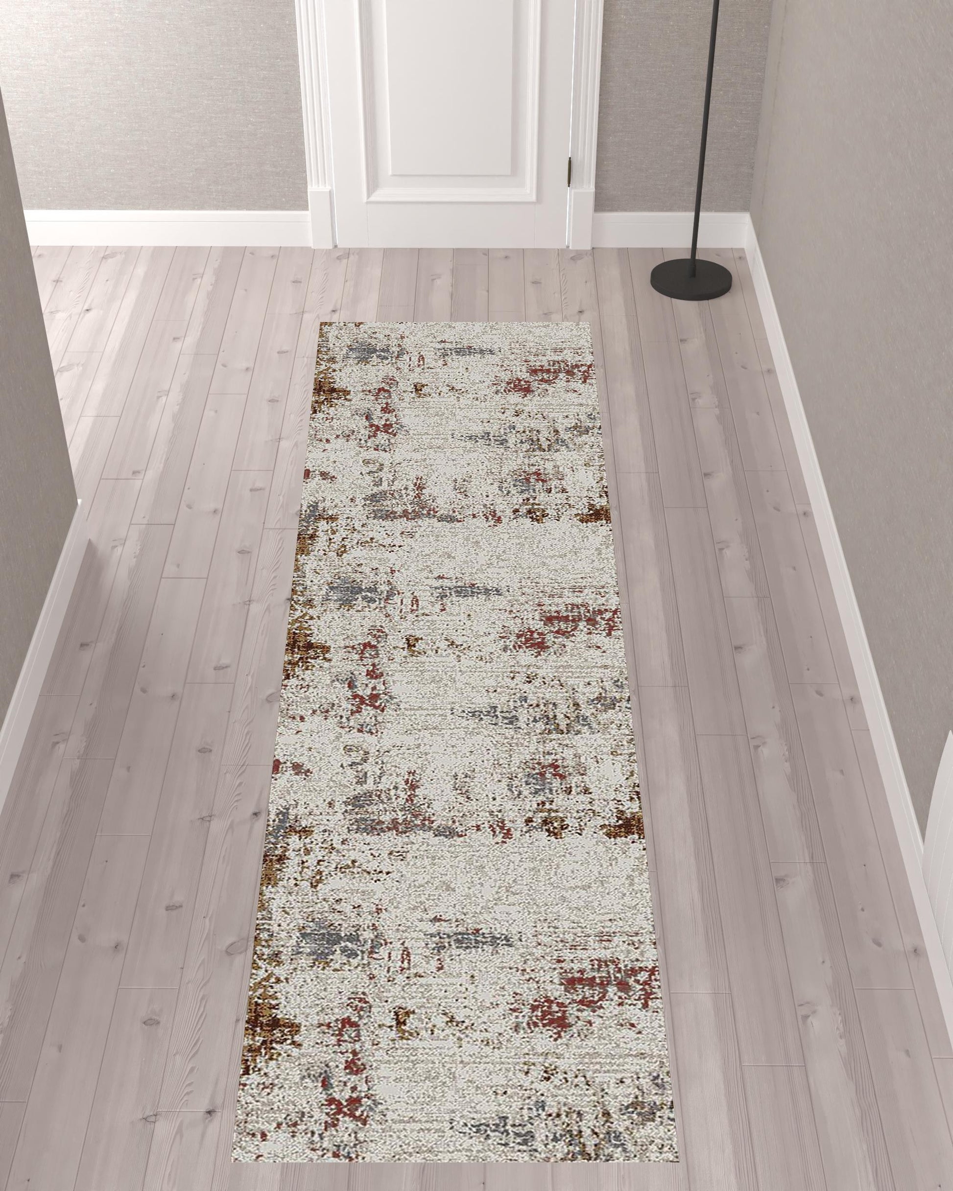 Add some artistry to your room with this 10-foot red and ivory abstract power loom runner rug. This runner shaped rug features a abstract design in red and ivory to give it visual interest. A classic shape marries with good looking design for your space place this area rug against a hardwood or tile floor and it will enliven your living space with style and sophistication. 0.39-inch H x 32-inch W x 120-inch D