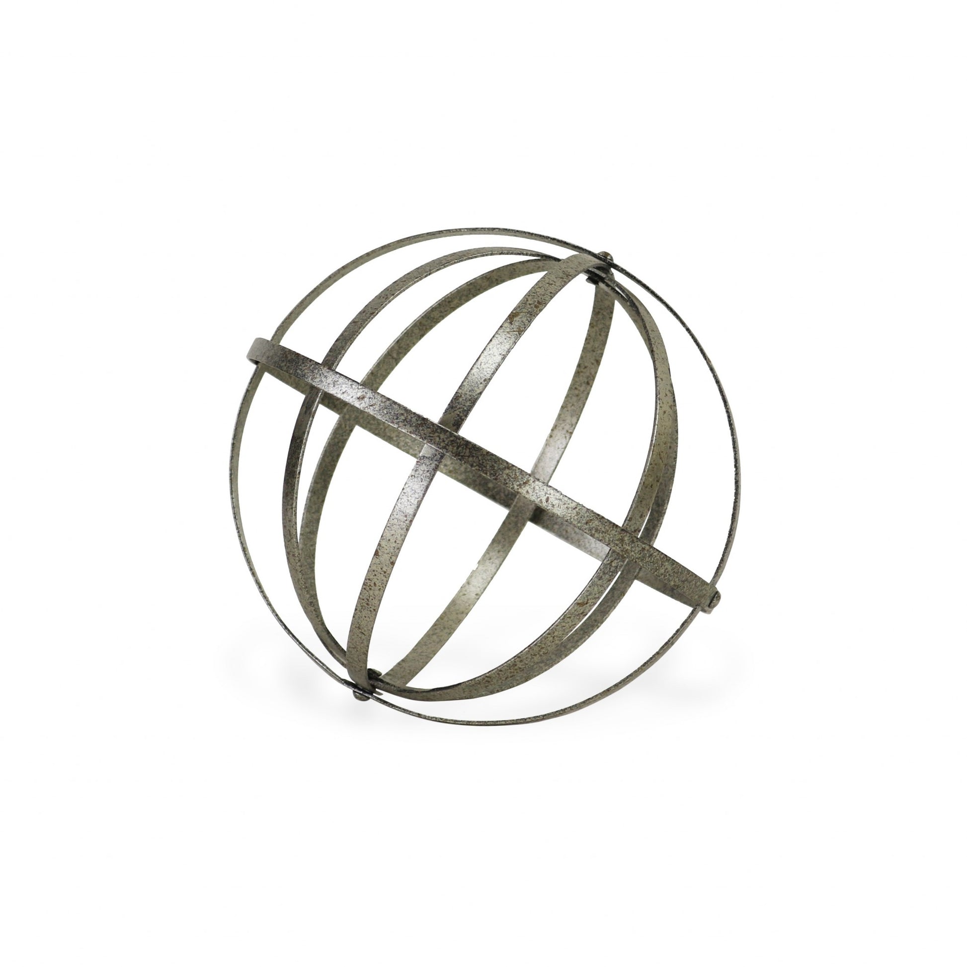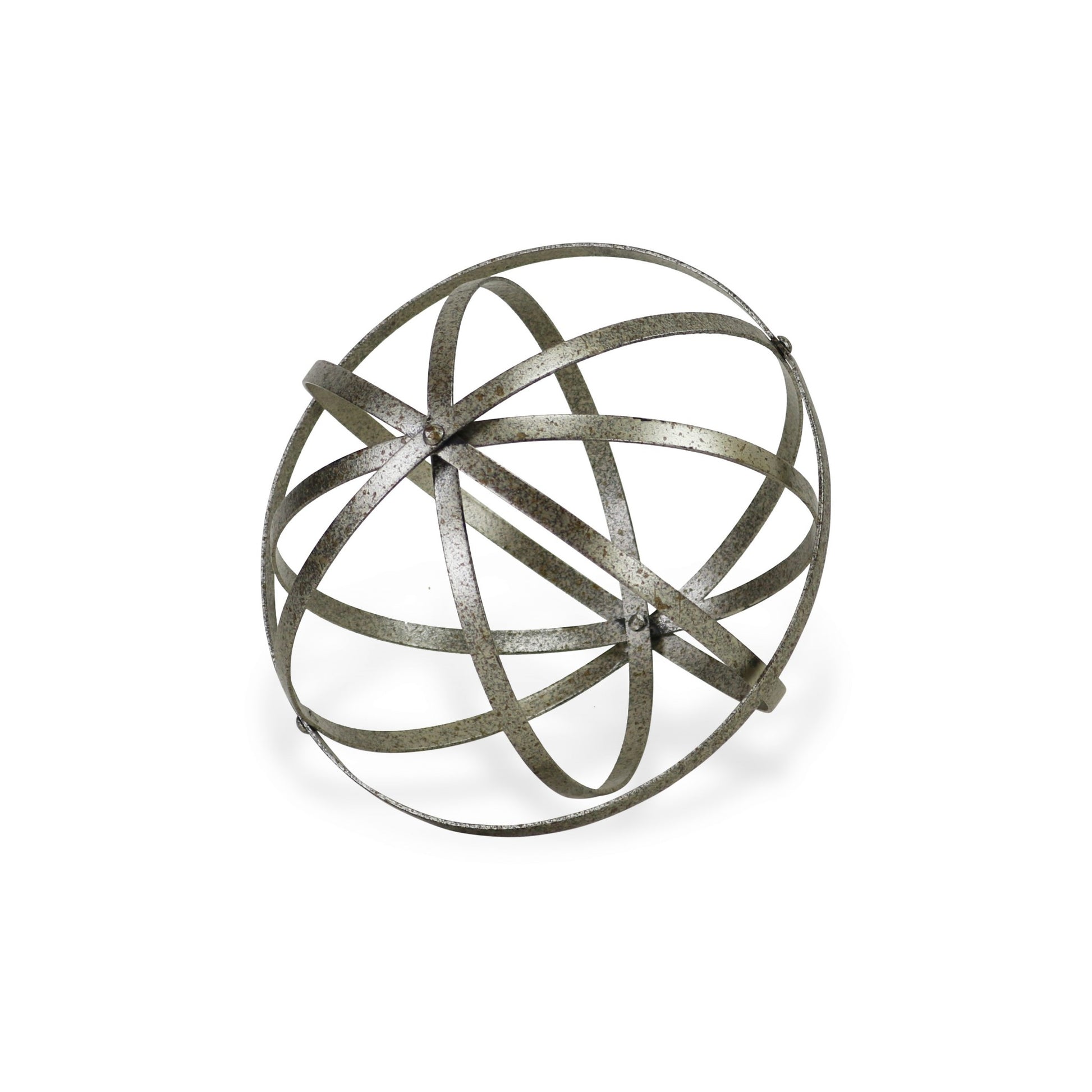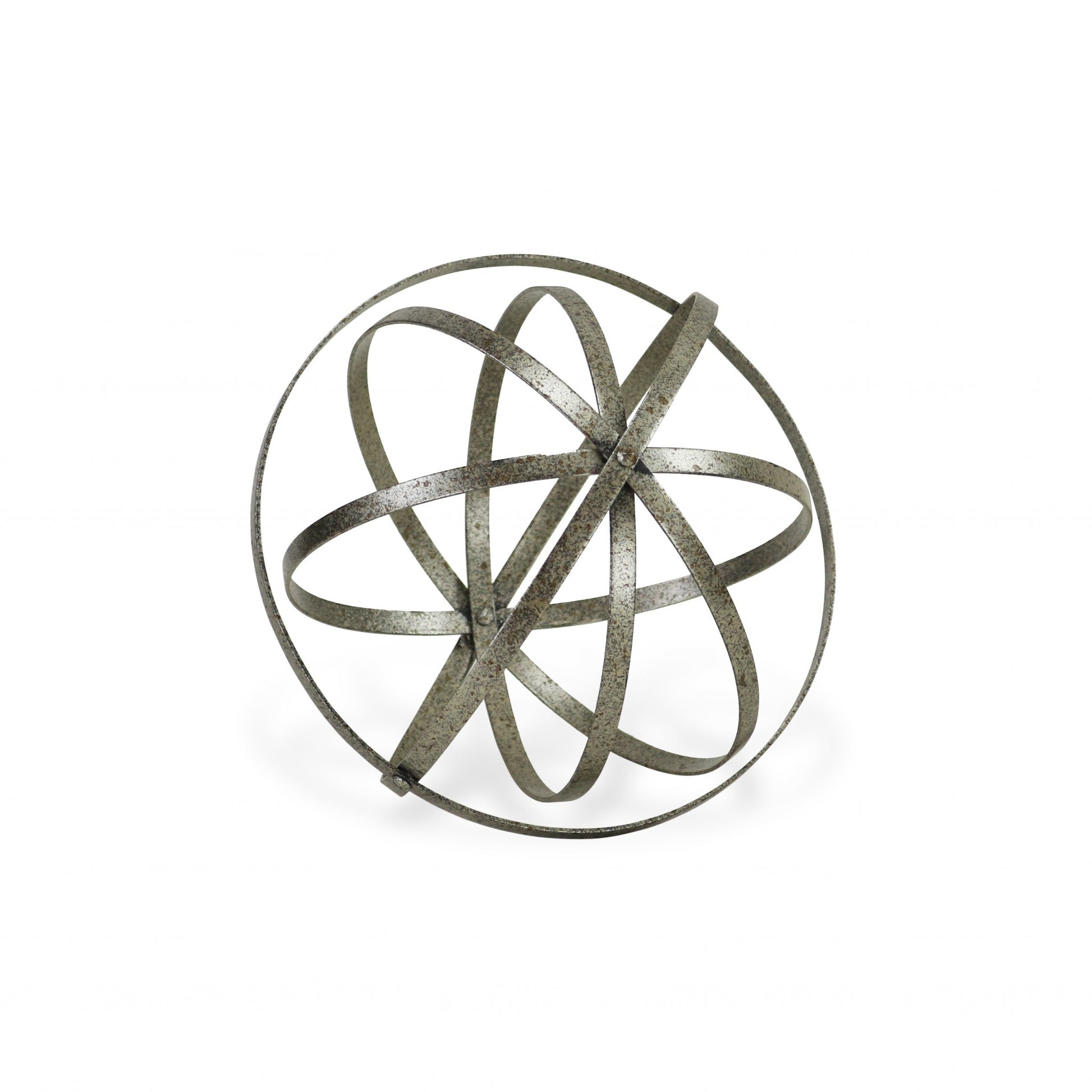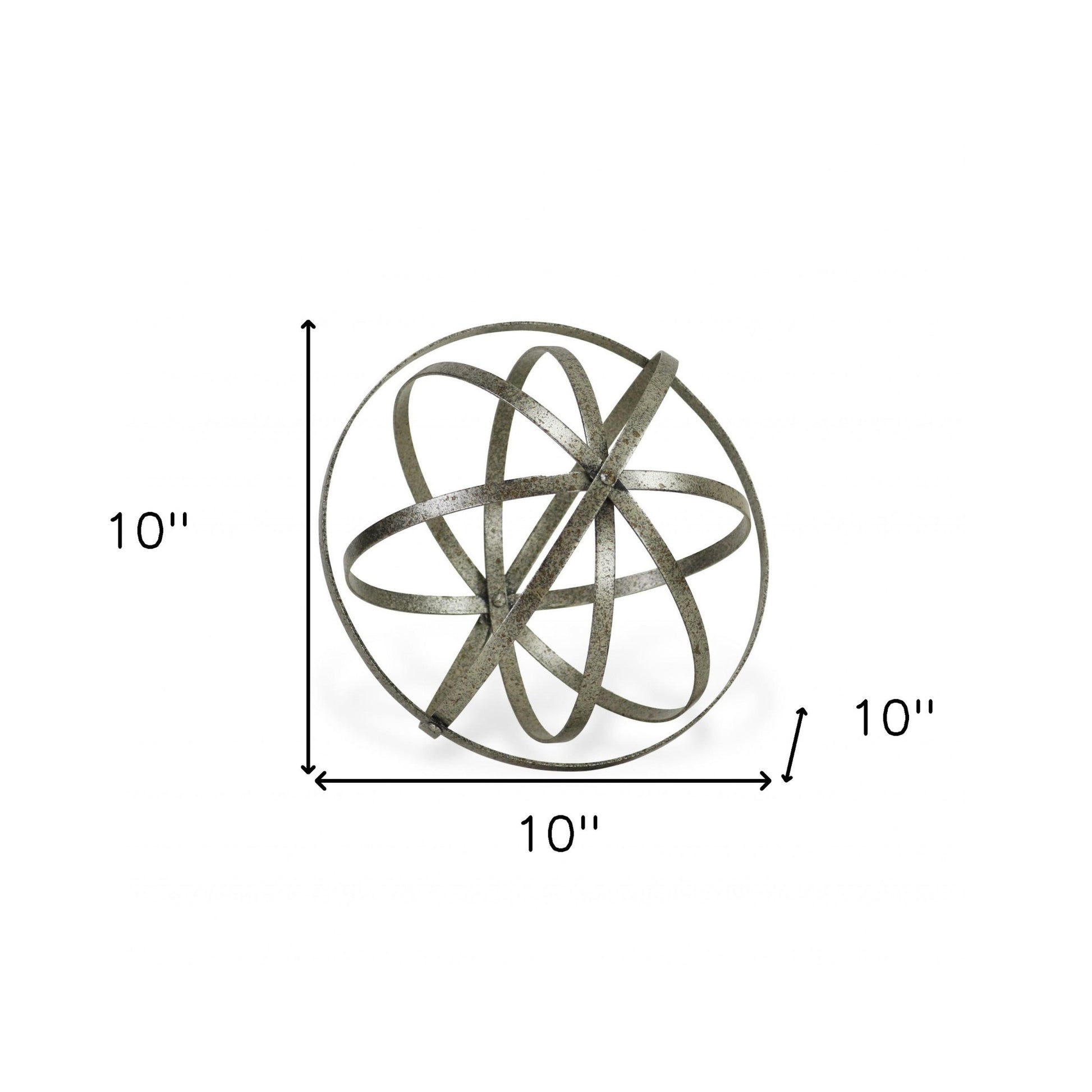 Add a touch of contemporary design to any space in your home with this Speckled Gray Metal Orb Decorative Sculpture. This piece is made from metal and has a shiny distressed silver color. The orb shape features an outer circle inside of which there are oval shapes that intersect and create a geometric shape. This unique piece will look great grouped with other decor pieces you may have on your mantle, bookshelf or your coffee table, or you can use it as an accent piece on its own. 10" H x 10" W x 10" D