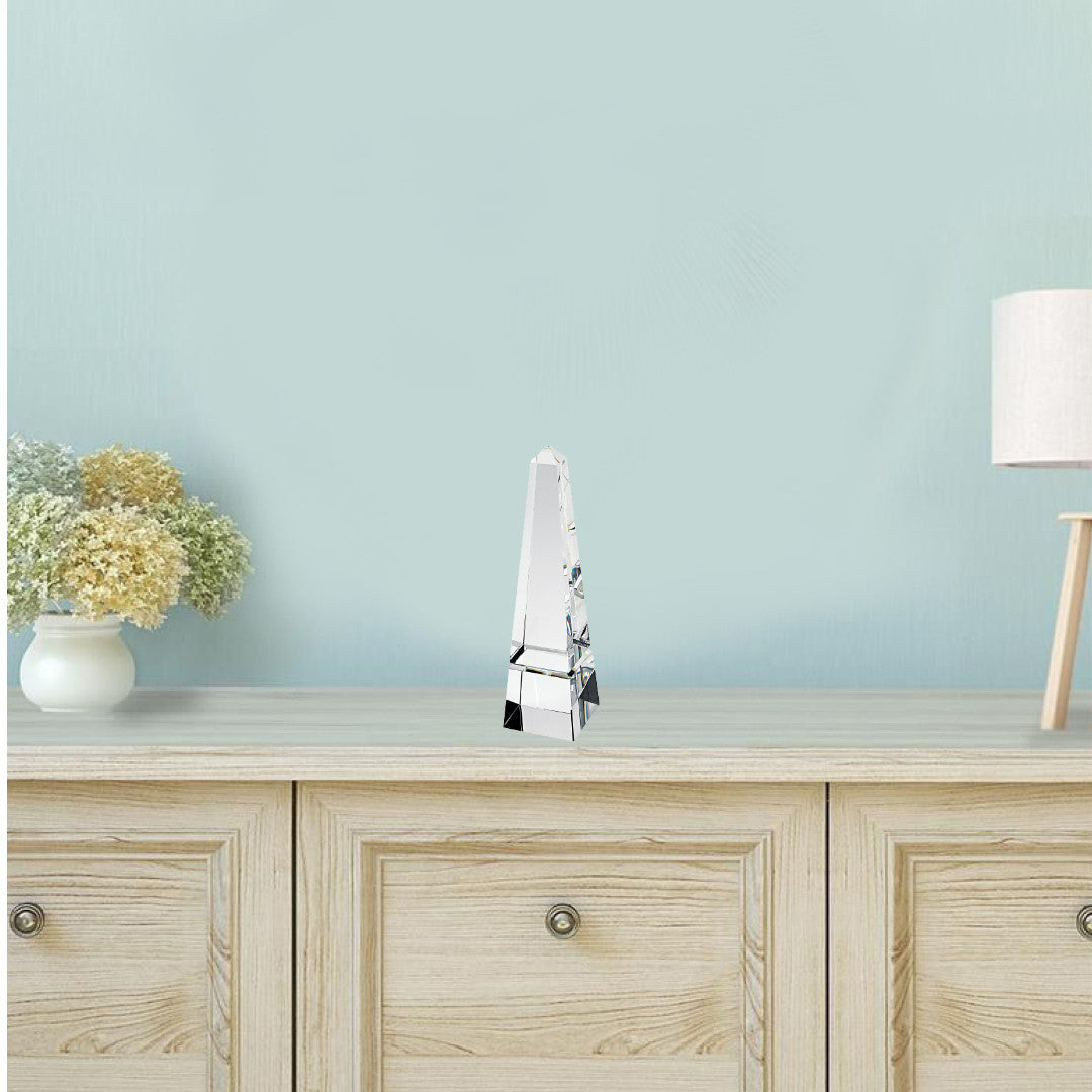 This 10.5-inch clear crystal obelisk statue will add a beautiful decorative accent to your decor. This statuesque and prismatic faceted crystal monument will be a beautiful addition to your desk, mantle, bookshelf, or dresser. This hand-crafted piece is made of high quality mouth blown lead free crystal. A perfect decorative addition for anyone who loves a stylish look and feel. 10.5-inch H x 2.75-inch W x 2.75-inch D