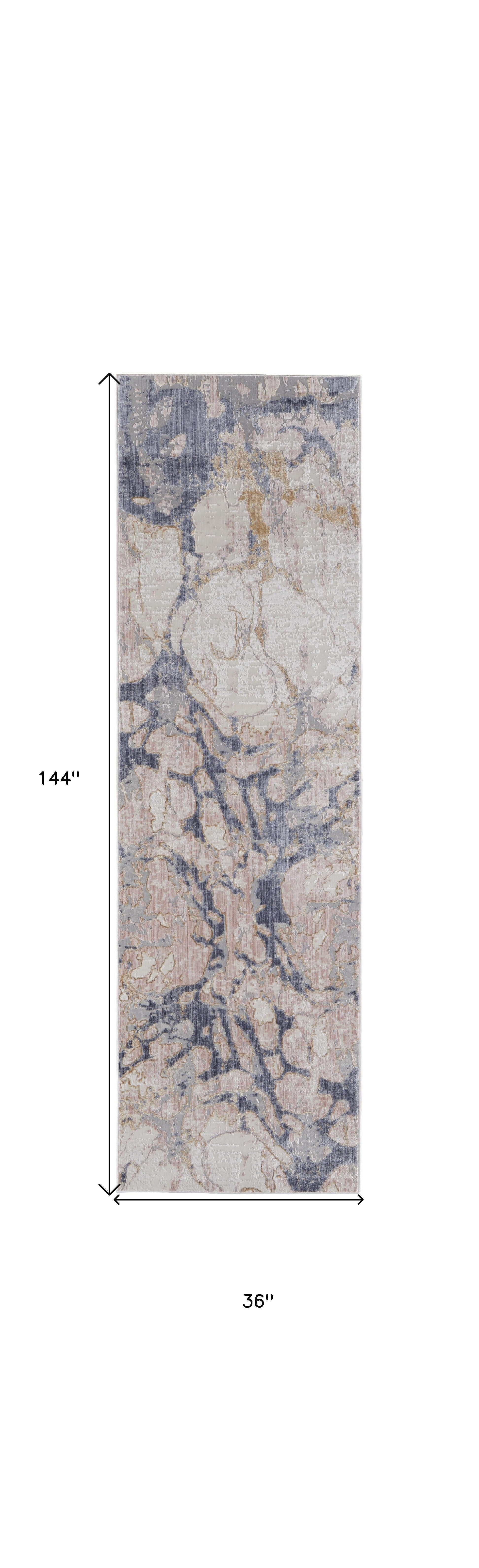 12' Beige and Blue Abstract Power Loom Distressed Runner Rug