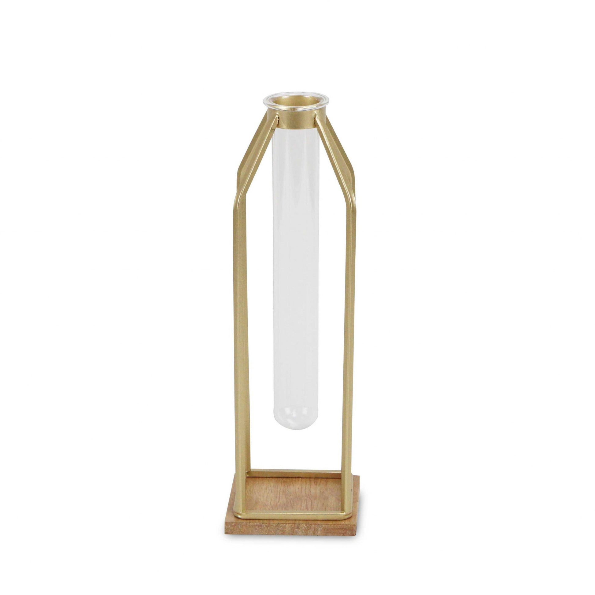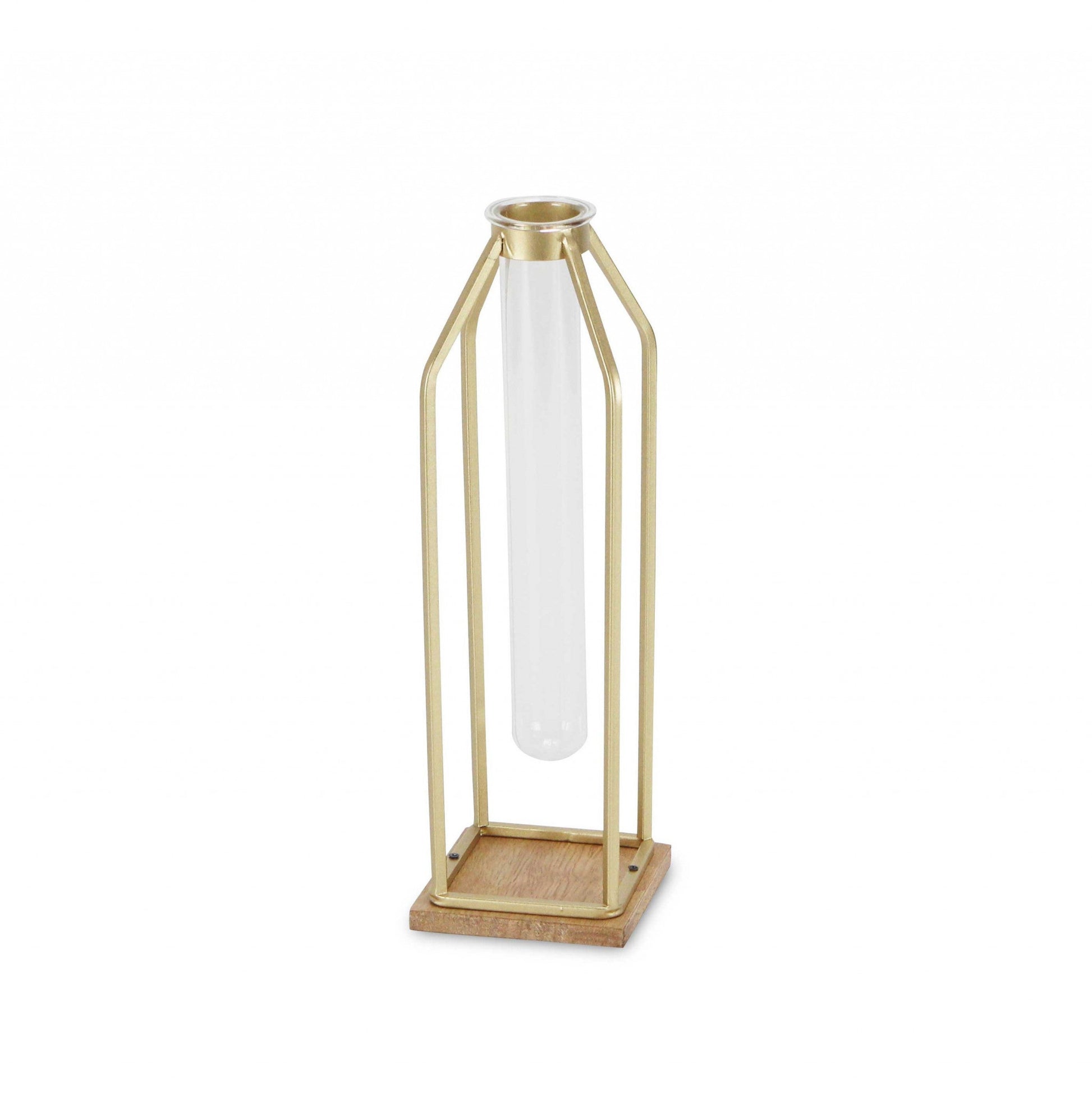 Unique and decorative, this 12" gold and clear contemporary glass tube will leave a lasting impression. This gold and clear colored piece is made from high grade glass and metal in a floating contemporary style. A perfect decorative addition for anyone who loves a stylish look and feel. You can be certain that you'll be leaving an impression with this unique piece. 12.25" H x 3.75" W x 3.75" D