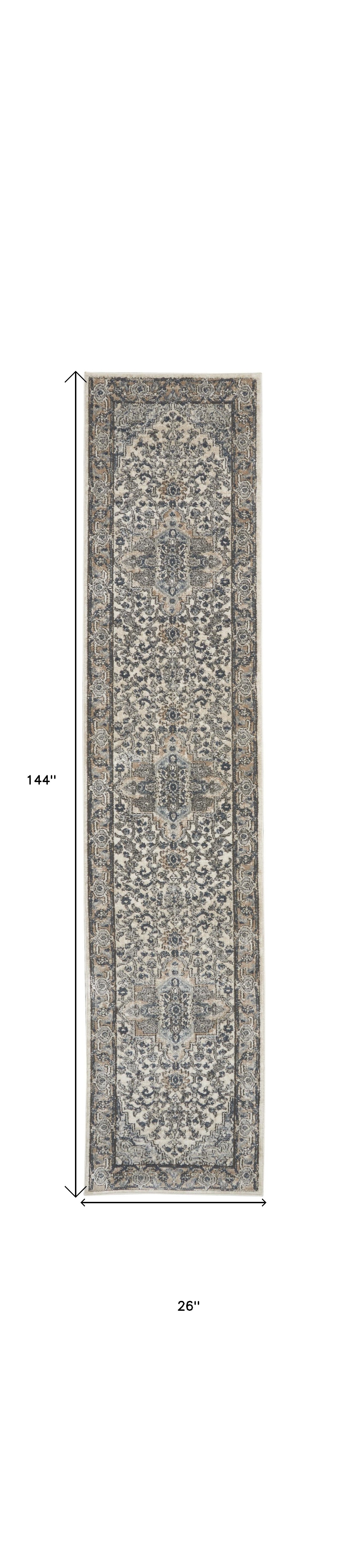 12' Gray and Ivory Medallion Power Loom Runner Rug