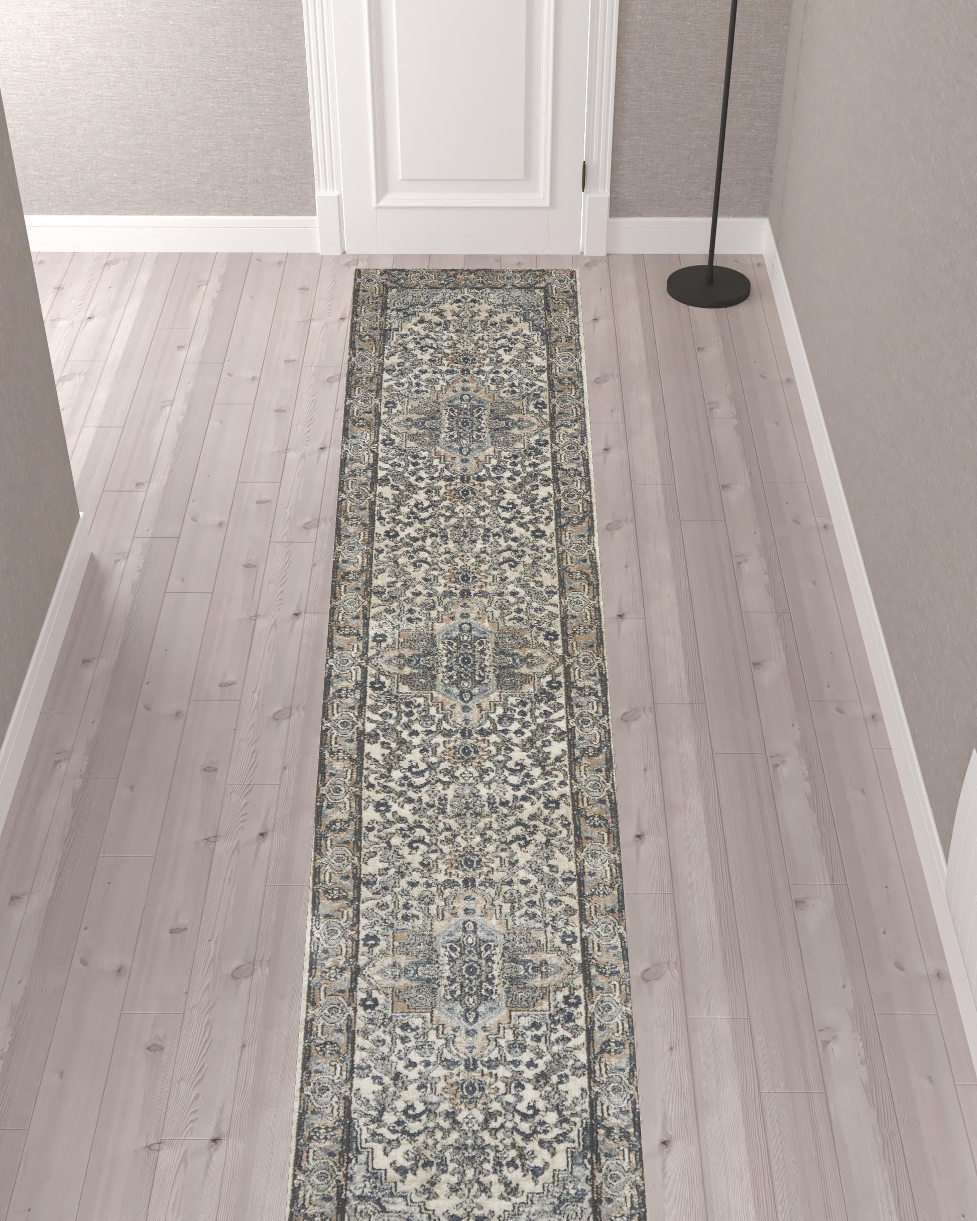 Set an inviting tone in your space with this 12-foot gray and ivory medallion power loom runner rug. This runner shaped rug features a medallion design in gray and ivory to give it visual interest. A classic shape marries with good looking design for your space place this area rug against a hardwood or tile floor and it will enliven your living space with style and sophistication. 0.32-inch H x 26-inch W x 144-inch D