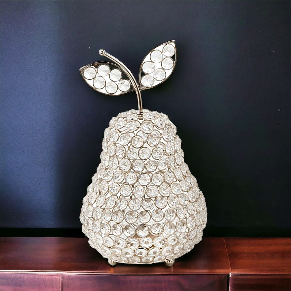 Sparkle and shine all day long with this 11.5" Silver Pear Faux Crystal Sculpture. An elegant and exciting statement piece this gorgeous medium size pear will light up the room. The shimmering faux crystals and silver base make this a sparkling and special accessory for your tabletop, dresser, hutch, or mantle. 11.5" x 6.5" x 6.5"