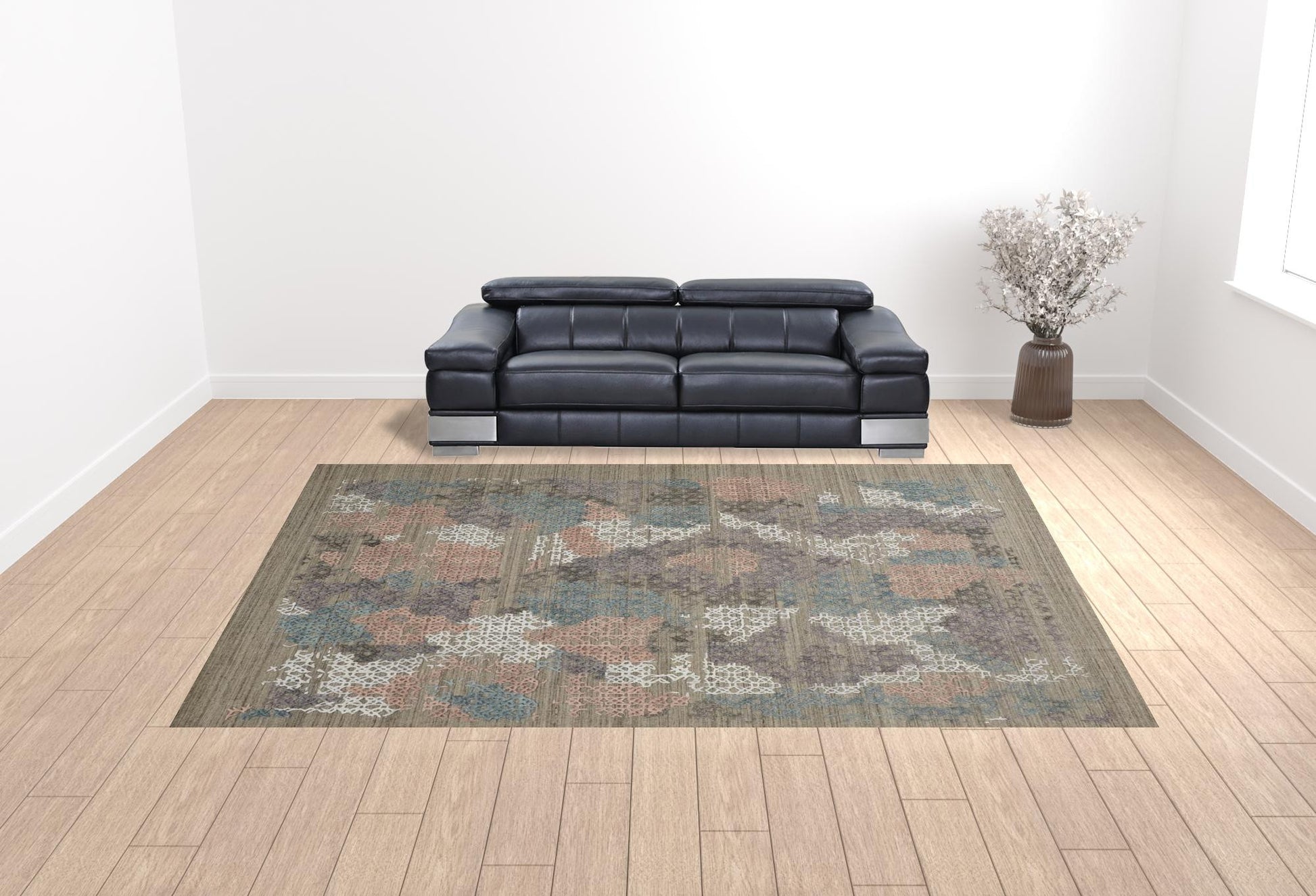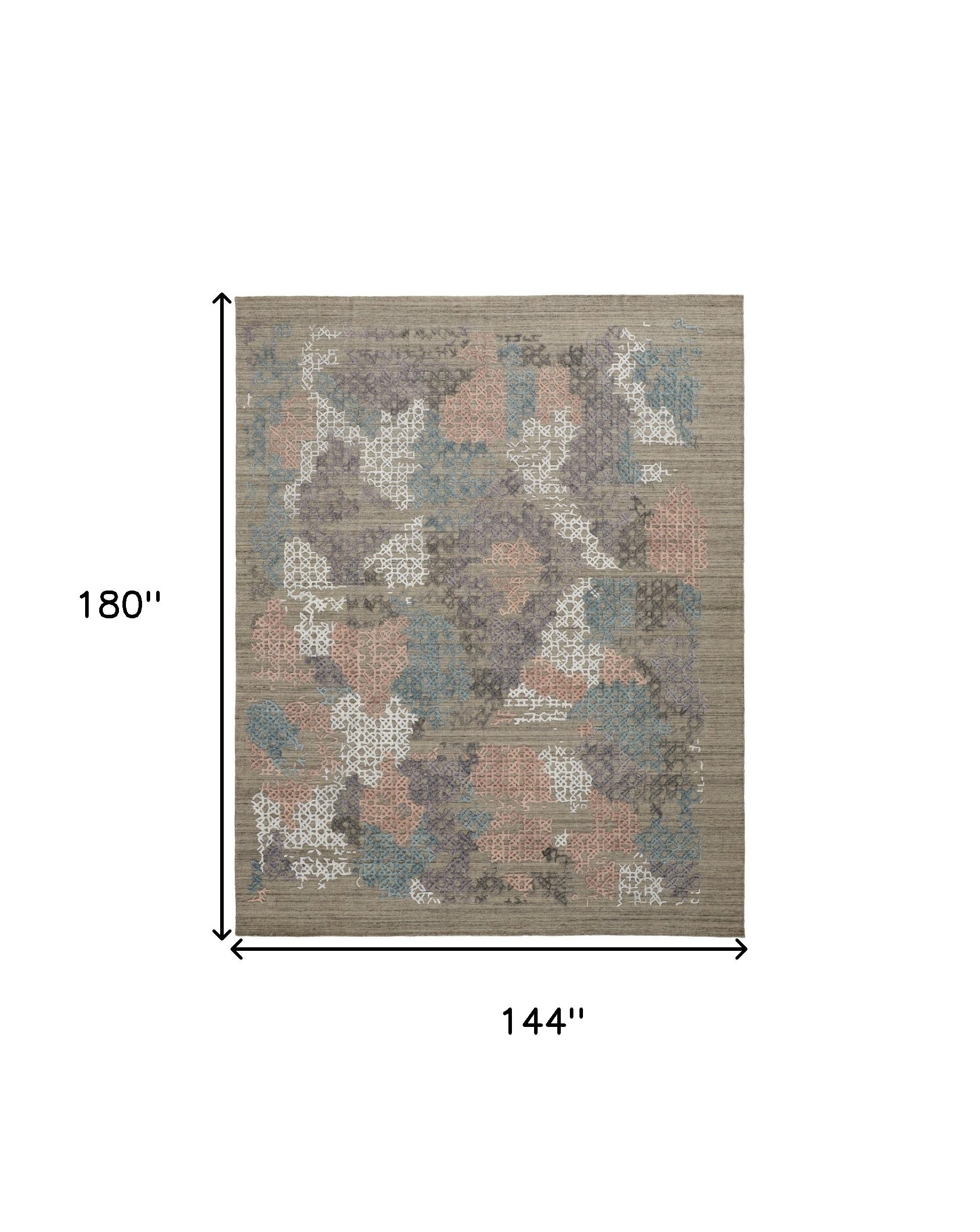 12' X 15' Pink Blue And Taupe Abstract Hand Woven Distressed Area Rug
