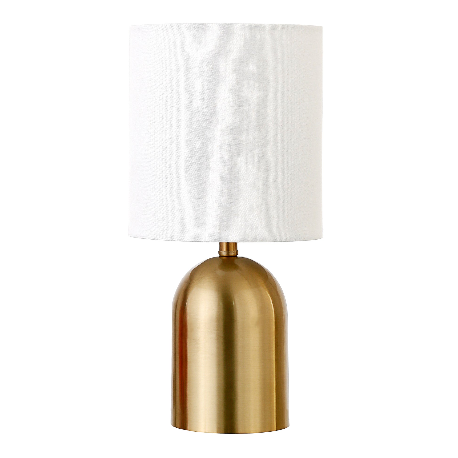 Embrace the good life with this hard working and stylish 13-inch gold metal cylinder table lamp with white drum shade. The lamp is made of sturdy metal and features a gold color. The white drum fabric shade is a great compliment to this lamp. This standard table lamp is designed to provide general lighting to the area. Use this lamp anywhere and elevate the look of the whole space. It is perfect for virtually any decor. 13-inch H x 6-inch W x 6-inch D