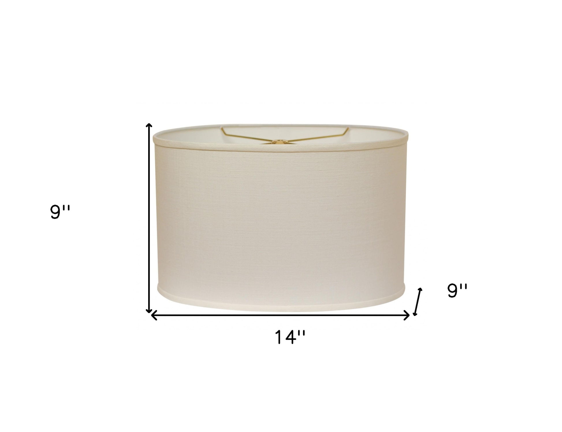 This White Throwback Oval Linen Lampshade has a hint of mid-century modern flair and will be a great addition to your lamp base. This hardback lampshade includes a standard washer fitter that fits over a standard harp and can be used with your existing finial design. This high quality crafted oval shape has a slight slant to give it some visual interest and is crafted of the finest linen innsbruk cotton with a fold on top and bottom of the shade. 9" x 14" x 9"