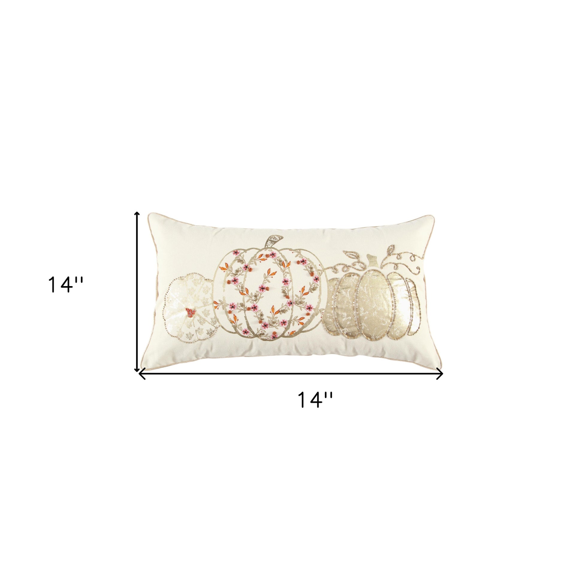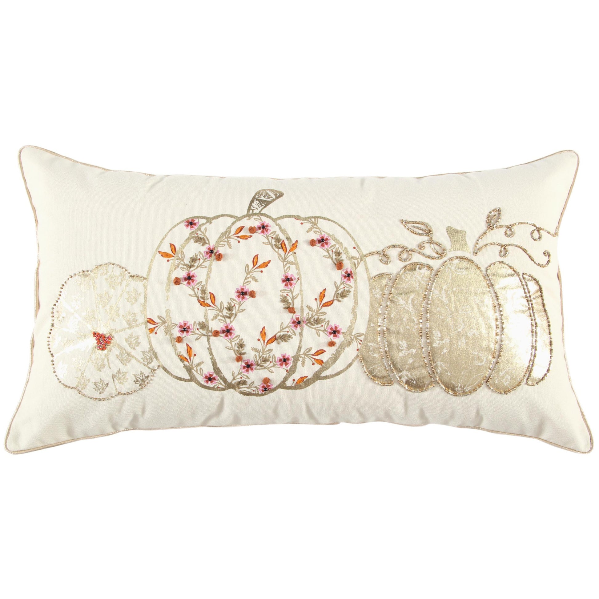 Set a festive fall mood with this cozy and fun 14-inch x 14-inch gold and ivory thanksgiving cotton pillow with embroidery, beads, pom poms edges. The gold and ivory coloring of the soft and long lasting 100% cotton will add dimension and texture to your space. Super soft and built to hold its shape, this polyester pillow is a great option. Great to use on its own or mix with other decorations for the perfect look. A great decorative accessory for your favorite chair, to accent your sofa, or to use as part of your bed ensemble. 14-inch H x 14-inch W x 6.25-inch D