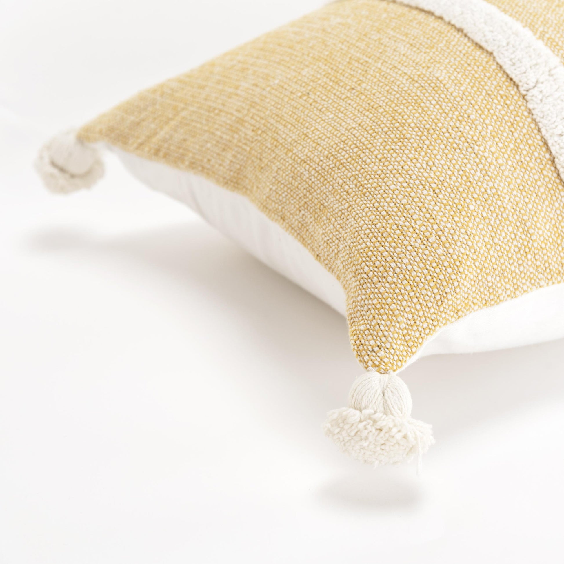 The perfect complement to your sofa, favorite chair, or bed, this 14-inch x 14-inch yellow and white cotton pillow with tassels edges is a great decorative accent. This super soft decorative pillow is expertly made of high grade, long lasting 100% cotton in a yellow and white coloration. Charming decorative tassels give this design texture along with a hand-crafted look and feel. This soft polyester pillow not only is decorative but made to be comfy and cozy all day long. For anyone that loves to decorate or accent their space with color and texture. Decorative pillows are a great way to change up the look and feel of your space easily and quickly. 14-inch H x 14-inch W x 6.25-inch D