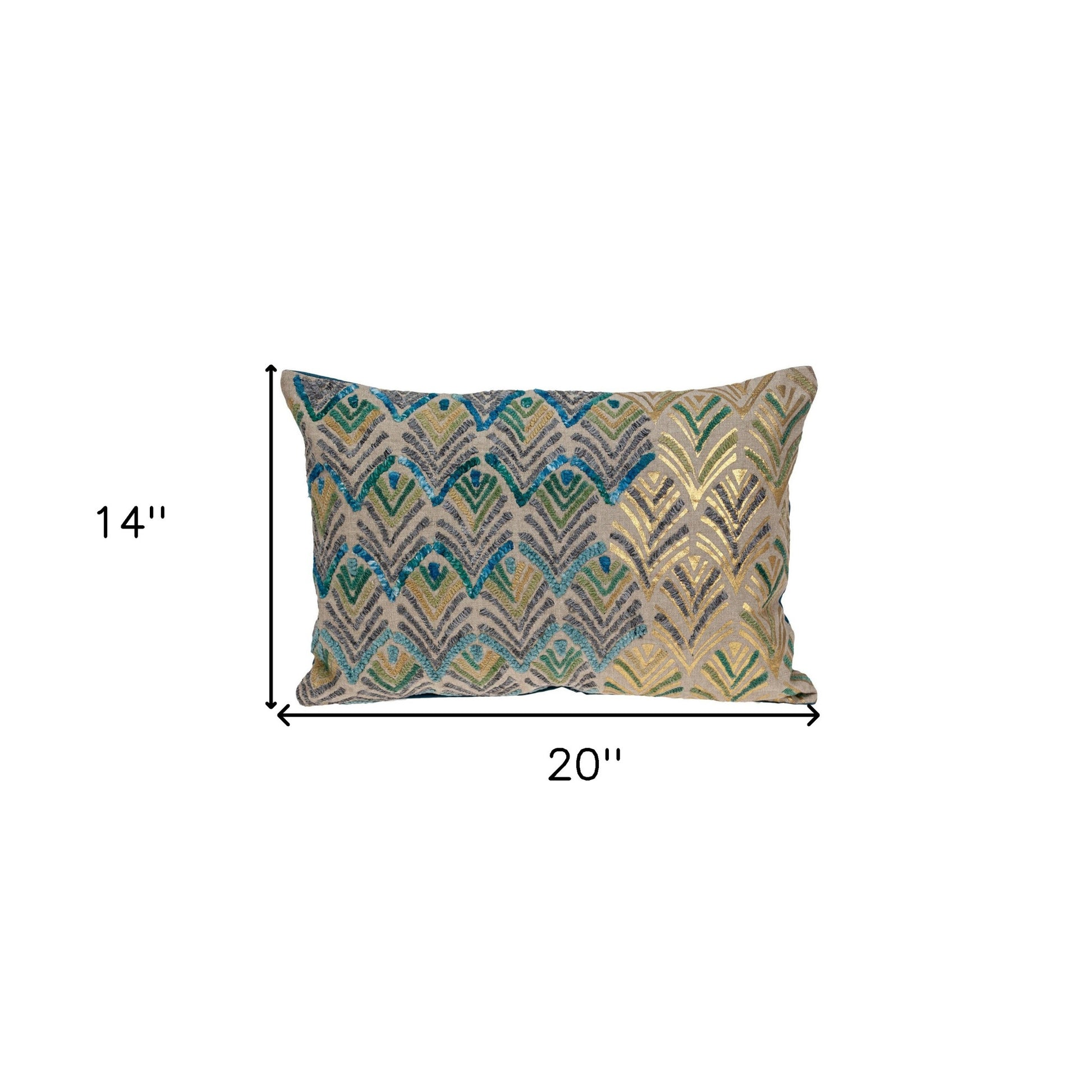 14" X 20" Beige And Green Zippered 100% Cotton Throw Pillow With Embroidery