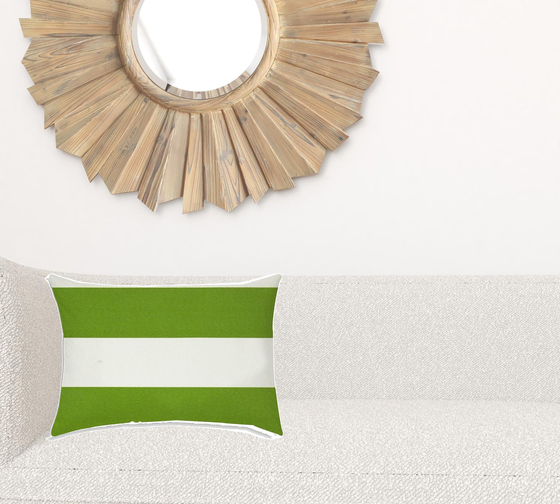 The perfect complement to your sofa, favorite chair, or bed, this 14" x 20" green and ivory blown seam striped lumbar indoor outdoor pillow is a great decorative accent. This green and ivory hued piece represents quality construction, expertly made from durable polyester that is not only long lasting but soft to the touch as well. A great decorative accessory to decorate indoors or out. Decorative pillows are a great way to change up the look and feel of your space easily and quickly. 20" H x 14" W x 5" D
