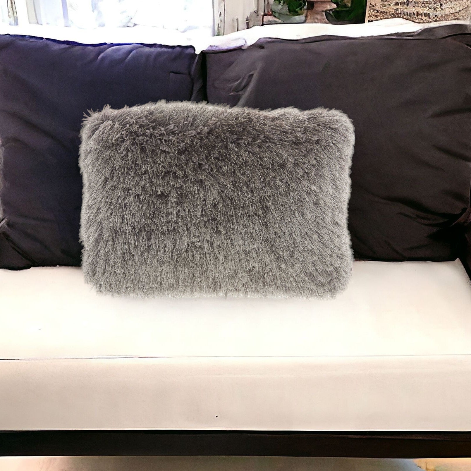 Encourage an indulgent style into your home with the addition of this luxuriously soft Slate Gray Super Shag Faux Fur Throw Pillow that will uplift the aesthetics of your living space while being functional. The subtle shade of slate gray and the faux fur shaggy fashion adds to its elegance providing a scrumptiously soft and stylish surface texture that looks great and is comfortable too. The full and fluffy look of this shaggy throw pillow will instantly transform any space. 14-inch H x 20-inch W x 6-inch D