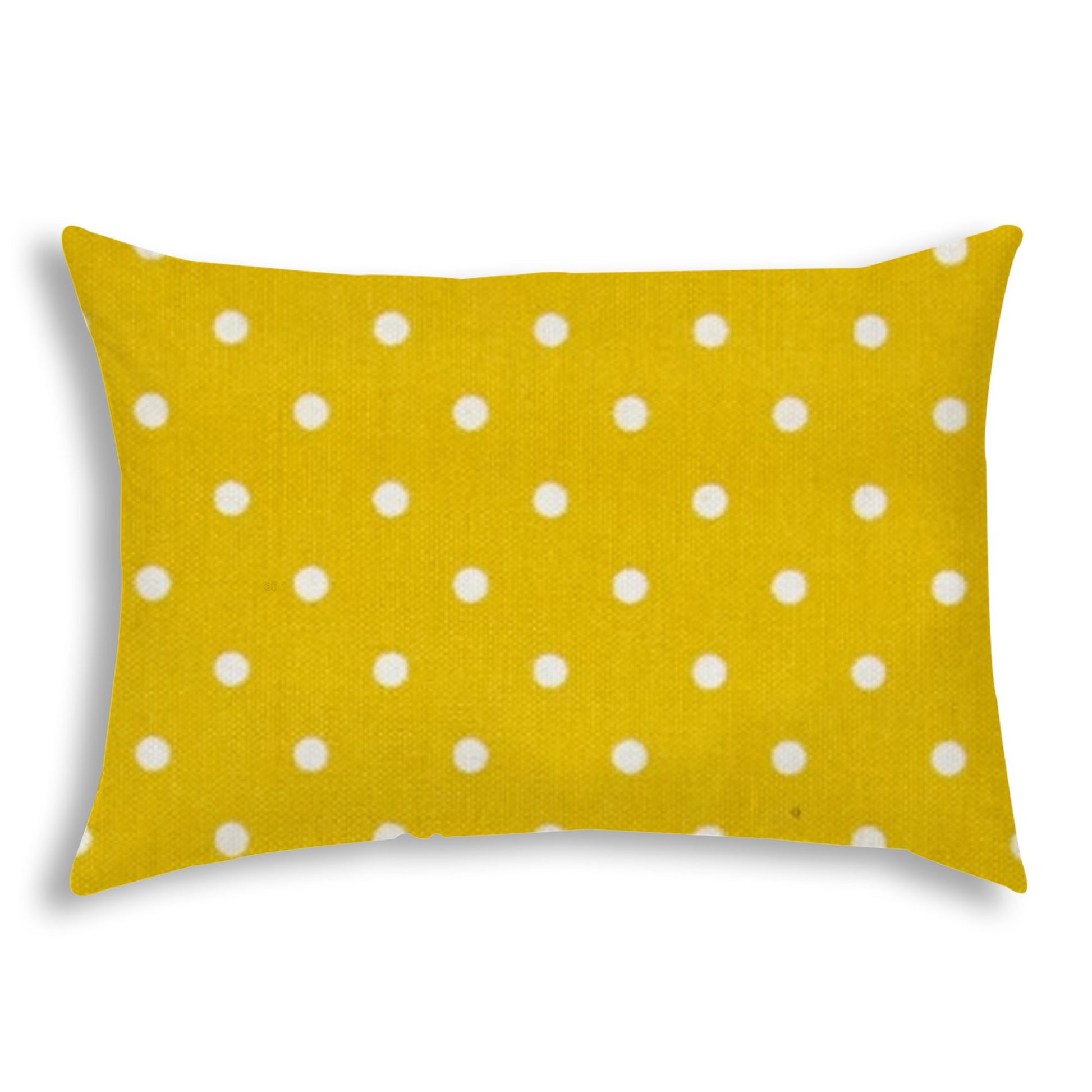 The 14" x 20" white and yellow blown seam polka dots lumbar indoor outdoor pillow is the perfect decorative accessory for your home. This soft and durable decorative pillow is expertly made of high grade, long lasting polyester in a white and yellow coloration. Durable and easy to care for this pillow is designed to withstand the elements and still look great. A great decorative accessory for your favorite chair or to accent your sofa. 20" H x 14" W x 5" D