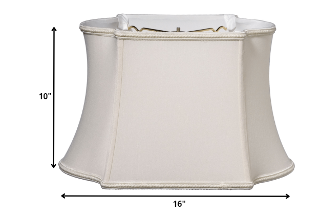 This 16" Cream Premium Oblong Shantung Lampshade has a hint of traditional flair and will be a great addition to your lamp base. This fancy oblong softback lampshade includes a washer fitter that fits over a standard harp and can be used with your existing finial design. This high quality crafted oblong shape has a slight slant to give it some visual interest and is crafted of the finest shantung with a fold on top and bottom of the shade. 10" x 16" x 10"