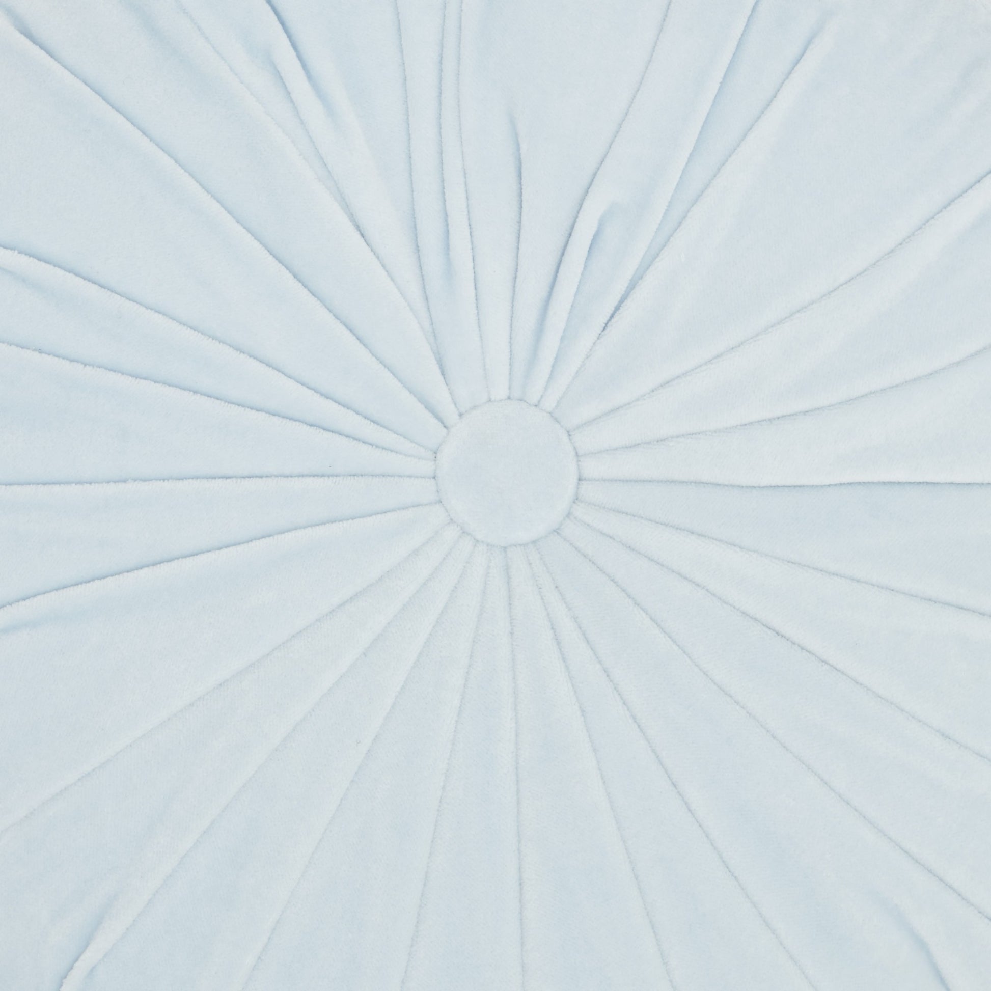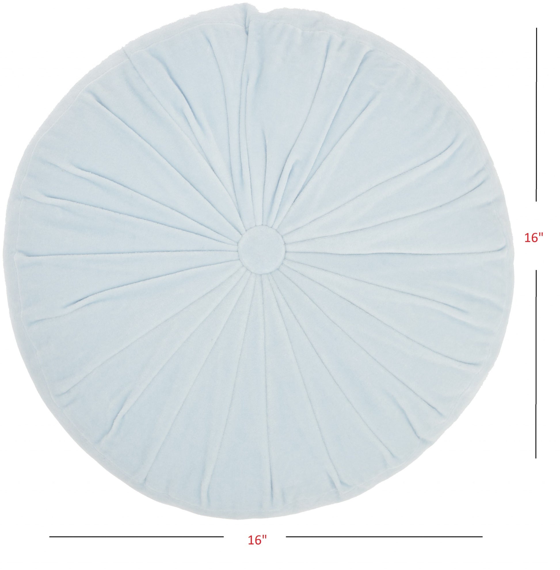 This Periwinkle Tufted Round Throw Pillow is the perfect way to add some unique design and comfort to your home. This pillow has a round shape and is covered in a stunning periwinkle colored fabric. This fabric has a very soft and velvety feel to it which adds to the comfort that this throw pillow provides. This pillow has tufting in the middle which gives it the pleated look and is completed by a periwinkle colored button holding it all together. This round throw pillow will add a nice depth to any pillow decor you have on your bed, on your couch or can be used as a stand alone pillow on your favorite chair as well. 5" H x 16" W x 16" D