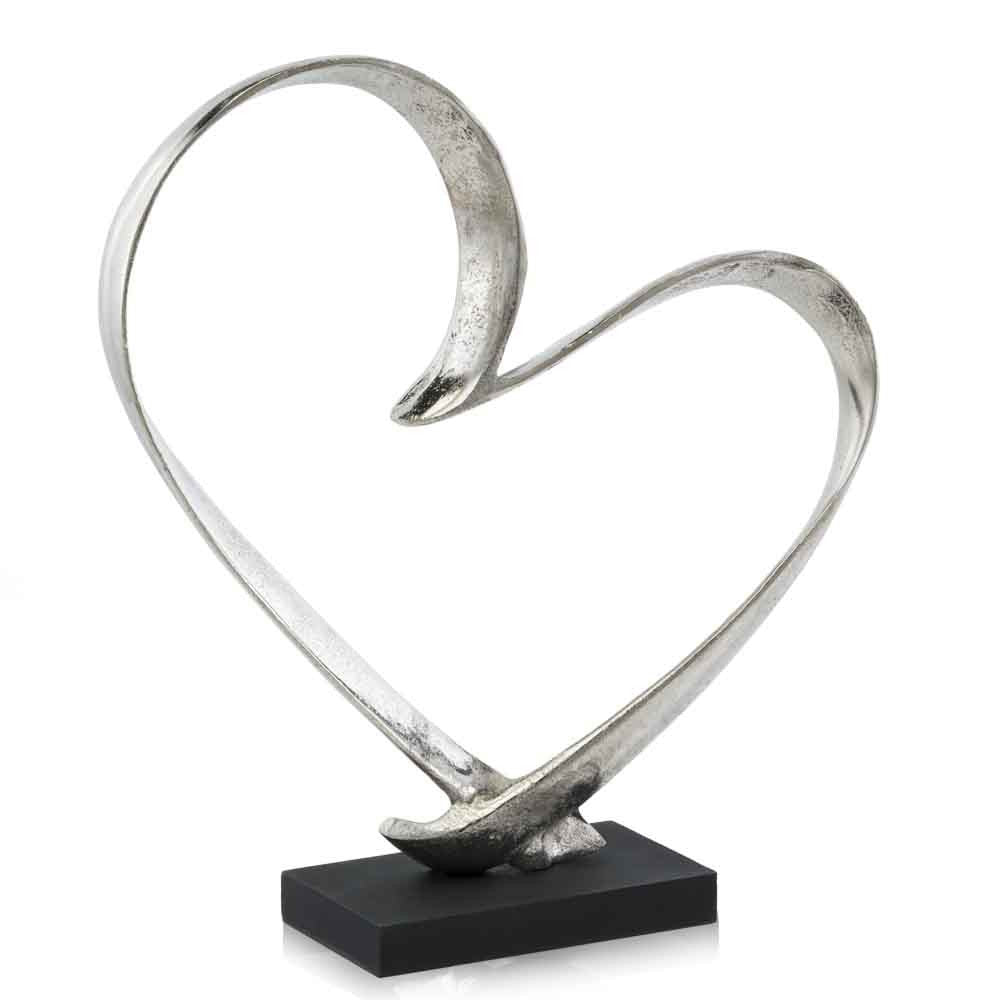 Unique and decorative, this raw silver and black heart sculpture will leave a lasting impression. Hand-crafted, this modern and slightly abstract heart with a crisscross at the bottom is formed from rough hewn aluminum and attached to a black wooden pedestal base. This sculpture makes a great tabletop accent for your coffee table, counter, bookshelf, mantle, or even dining table. It's a perfect addition for those who love an up-to-the-minute look and feel. 15.5-inch H x 4-inch W x 14-inch D