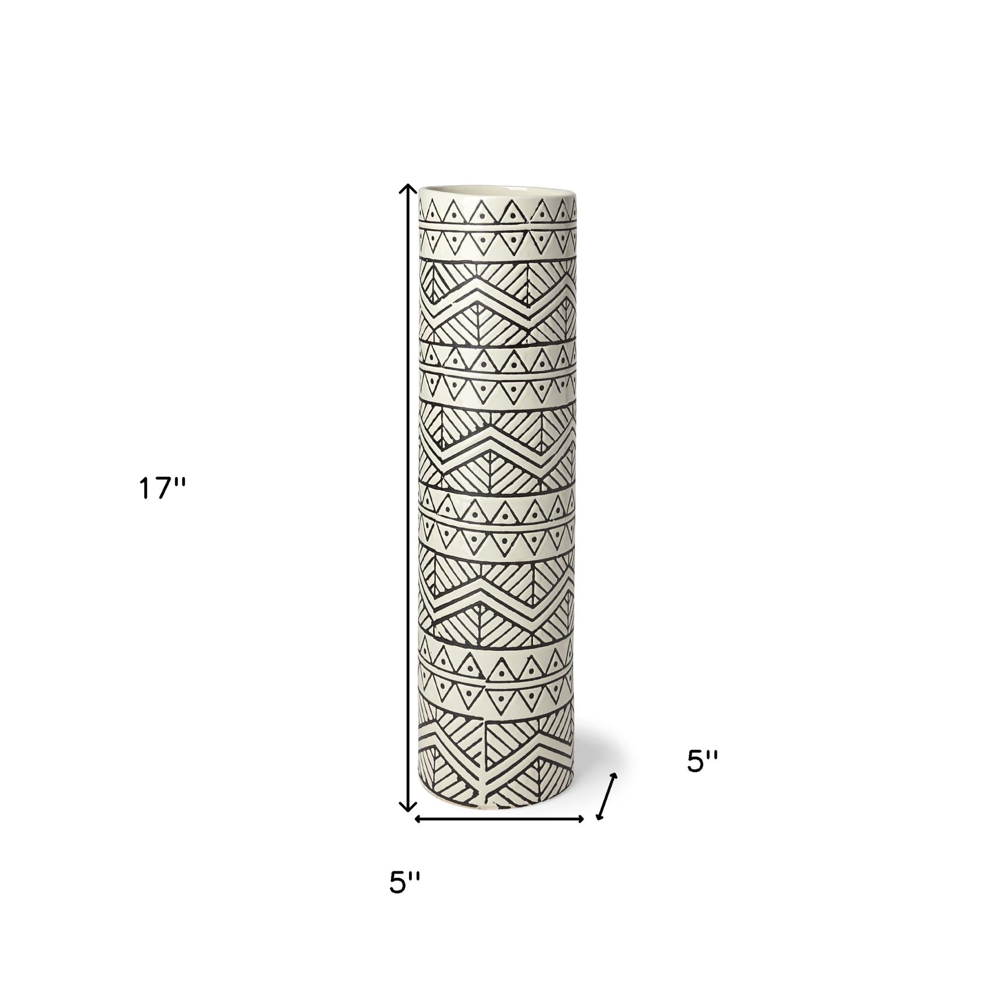 Enhance your home decor with this stunning 17-inch ceramic cream geometric cylinder table vase. Its exquisite geometric pattern adds a touch of elegance to any room. Crafted from high-quality ceramic, this table vase showcases a sleek cylindrical shape that complements modern aesthetics perfectly. The cream color effortlessly blends into any existing color palette, offering versatility and charm. Whether placed on a side table, console, or mantel, this vase is sure to be a captivating centerpiece. Its modern style effortlessly updates your interior decor and brings a sense of sophistication to your space. Elevate your home styling with this beautiful ceramic vase, perfect for displaying fresh flowers or as a striking standalone piece. 17-inch H x 5-inch W x 5-inch D