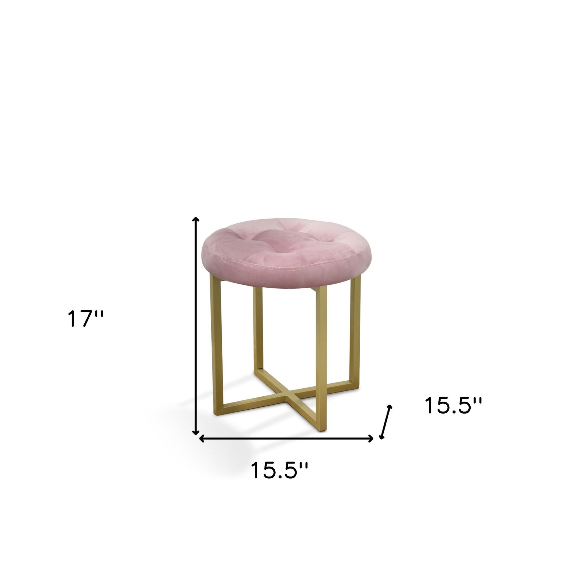 Fill your living room, bedroom, bathroom or office with fashionable seating options with this 17" Pink Tufted Velvet and Gold Stool. This timeless stool is versatile and can be used for extra seating, to get ready in the moring, as an ottoman, or can even be used to make a lasting impression on your guests by carefully setting out towels on it - the perfect way to convey class. The chair's well-padded soft upholstered velvet rests on a strong yet classic sturdy plated-steel base with a matte gold design detail to provide a strong support and long-lasting structure. 17 x 15.5 x 15.5