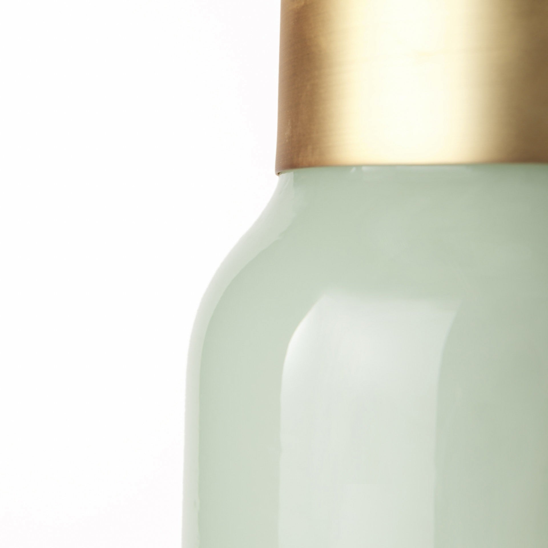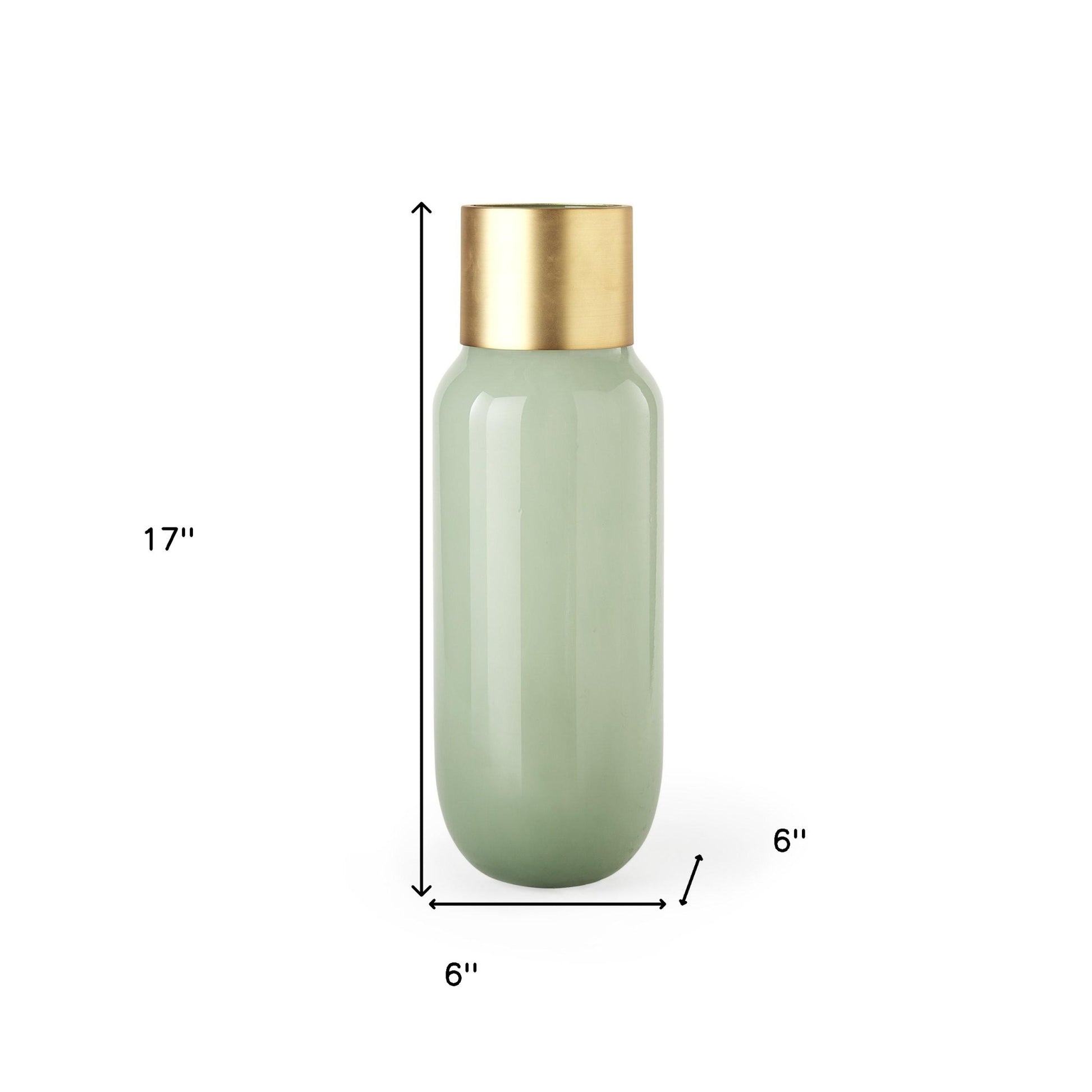 The perfect way to add some contemporary design to any space, this Smokey Green and Glass Narrow Vase is what is missing from the decor in your home. The body of the vase is made from soft smokey sage green colored glass that has a gold metal cuff rim at the top. Unique and modern with almost a retro feel, this vase will look great with any floral arrangements you display in it or you can use it as a unique decor piece. You can group it up with similar pieces or you can display it on its own on the bookshelf, the kitchen counter or the vanity table. 17" H x 6" W x 6" D