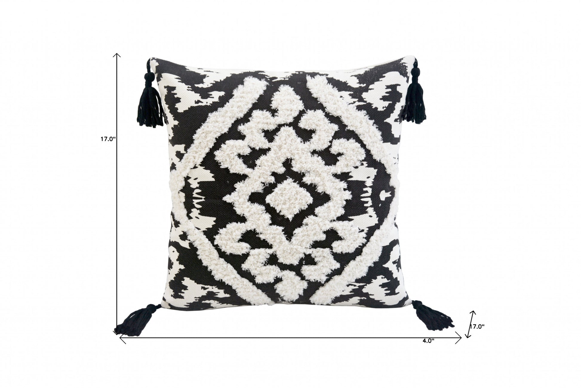 Bring a bit of fashion and zip to your space with this eye-catching and comfy 17" x 17" black and white textural geometric throw pillow with tassels. Charming decorative tassels give this design texture along with a hand-crafted look and feel. Decorative throw pillows not only add color and dimension to your space but can be comfy and supportive when you are lounging and cuddling as well. A great decorative accessory for your favorite chair, to accent your sofa, or to use as part of your bed ensemble. 17" H x 4" W x 17" D