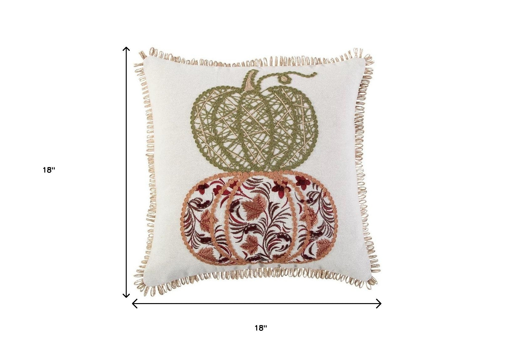 18" Ivory Green and Red Thanksgiving Cotton Pillow With Applique, Embroidery Edges