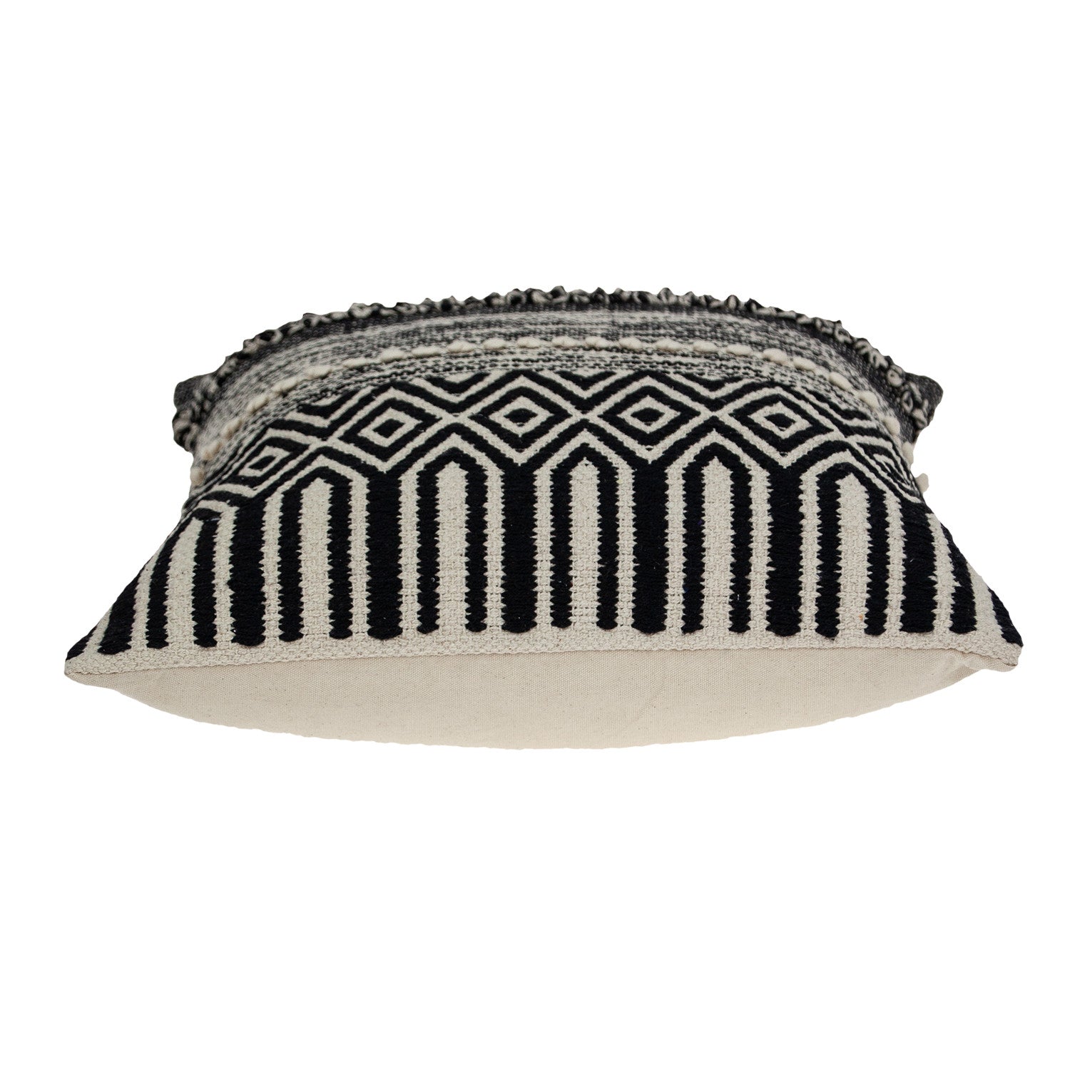 Unique and decorative, this comfortable 18" x 18" beige and black zippered 100% cotton throw pillow with embroidery will leave a lasting impression. Decorative throw pillows not only add color and dimension to your space but can be comfy and supportive when you are lounging and cuddling as well. A great decorative accessory for your favorite chair, to accent your sofa, or to use as part of your bed ensemble. 6" H x 18" W x 18" D