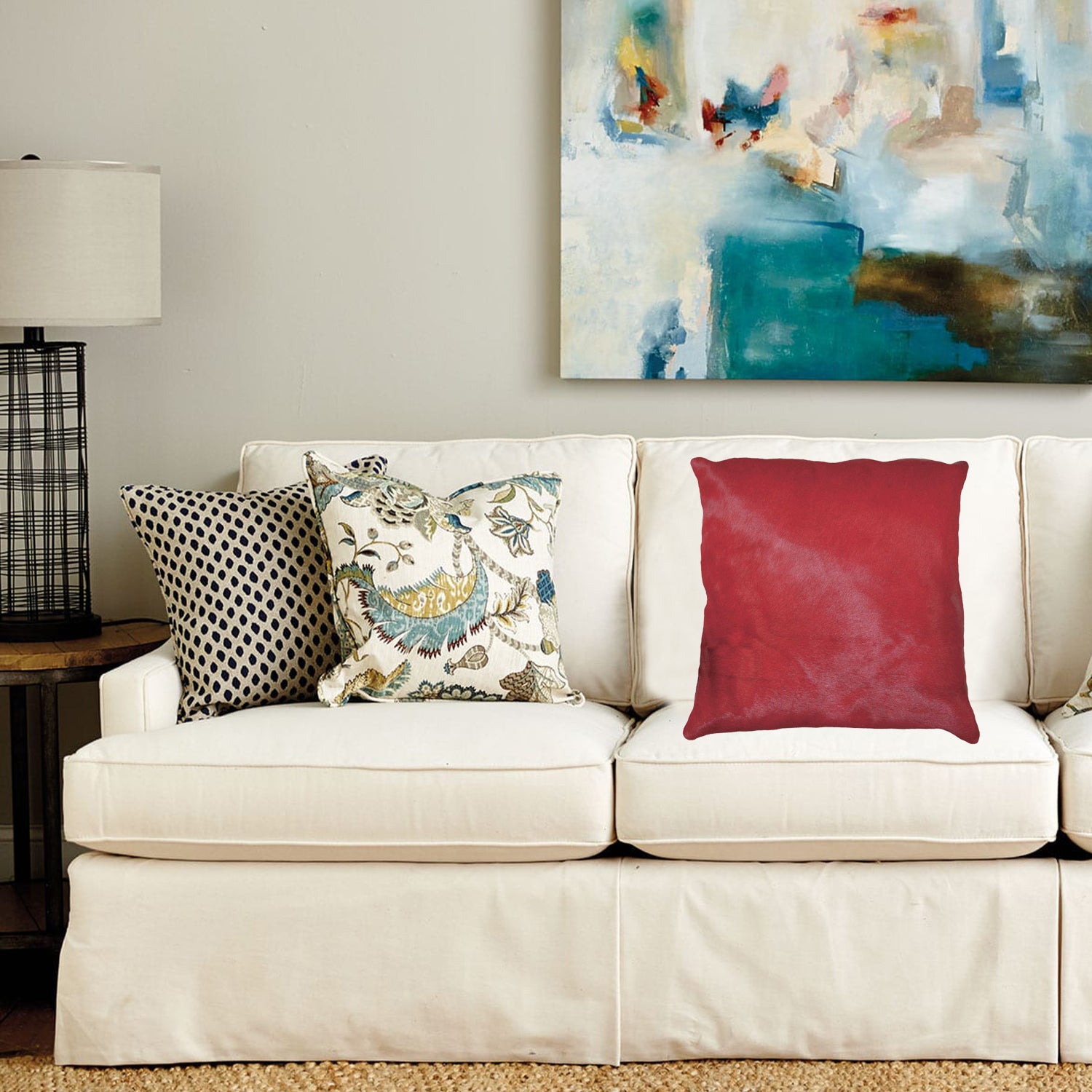 create a stunning outlook in your living room or bedroom with this luxurious cowhide pillow. our inspiring pillow is hand-cut and hand-stitched from the finest 100% indian cowhide. showcasing charming distinguished mottling and uniqueness in individual piece, each panel of the pillow is prudently chosen for its natural texture and wealth of color. what makes this stand out in any setting is the hidden zipper closure that comes with it, giving it a touch of professionalism and allowing the easy removal of the cover for cleaning. we back our exquisite cowhide pillow to add warmth, class and luxury to any home decor. - soft microsuede backing - naturally soft and smooth pile - polyfil insert - hidden zipper closure - hand tufted - durable construction and enduring design - large square shape is perfect for layering with other pillows - since this is a naturally made product, size and/or color may vary slightly - professional dry cleaning is recommended to maintain the integrity of the product as dyed colors may bleed