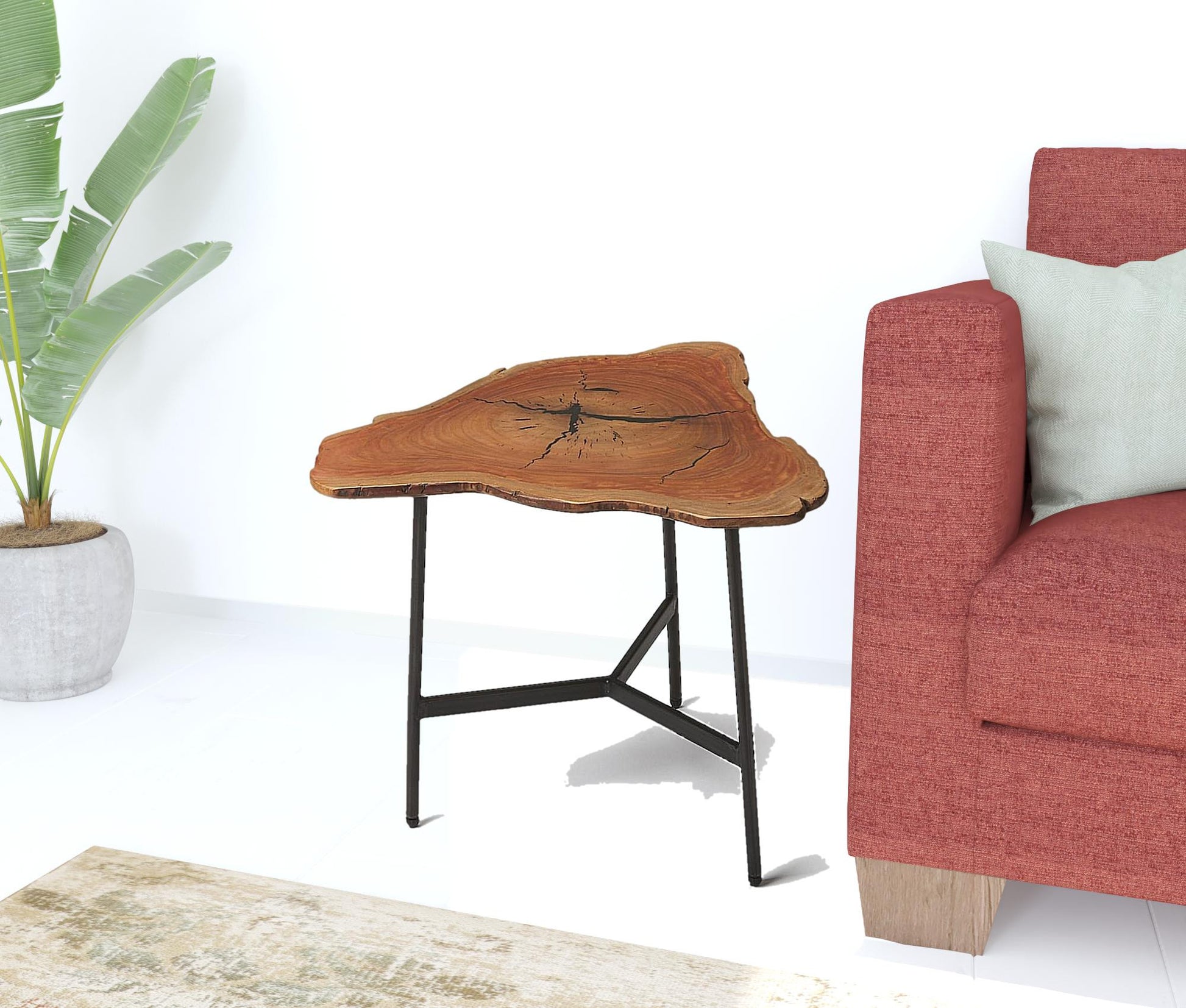 Show off your exquisite taste with this 19" black and natural brown solid wood free form end table. Quality construction from the black iron base combines with natural brown live edge design of the solid wood top to give this table a fresh and updated look. The purposefully distressed finish gives this table an authentically rustic feel. A great accent on either side of the sofa or bed, this adorable end or side table is just what you need. This versatile table is a great accent for most any room. 18.5" H x 24" W x 24" D