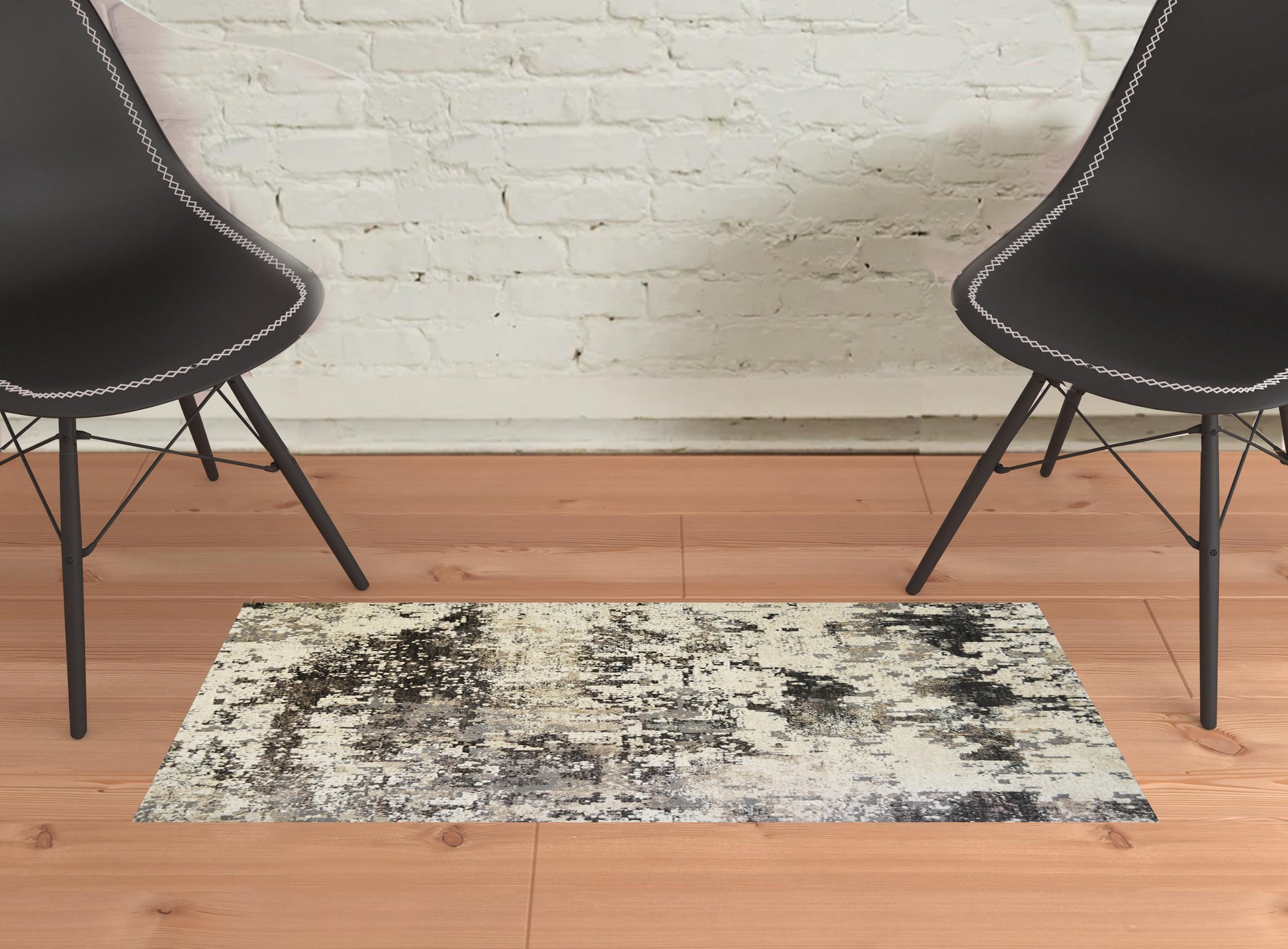 Set an inviting tone in your space with this 2-foot x 3-foot black abstract distressed area rug with fringe. This rectangle shaped rug features a abstract design in black to give it visual interest. A classic shape marries with good looking design for your space the coloration of this rug infuses an updated and modern vibe into your space. Ideal for spaces with kids and pets, this rug is stain resistant to help repel stains and spilled liquids. Tassel ends bring a timeless and fashionable look to your interior. Place this area rug against a hardwood or tile floor and it will enliven your living space with style and sophistication. 25-inch H x 39-inch W x 0.39-inch D
