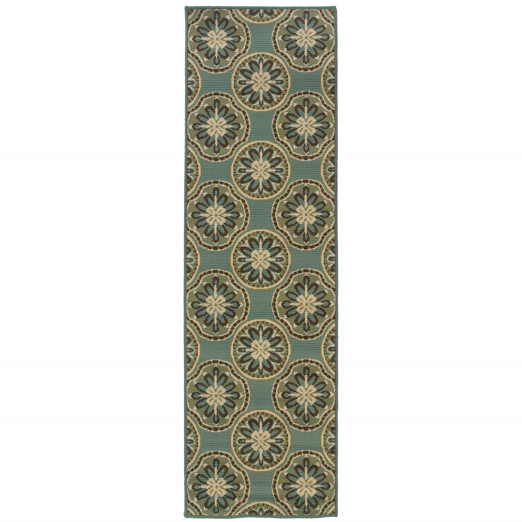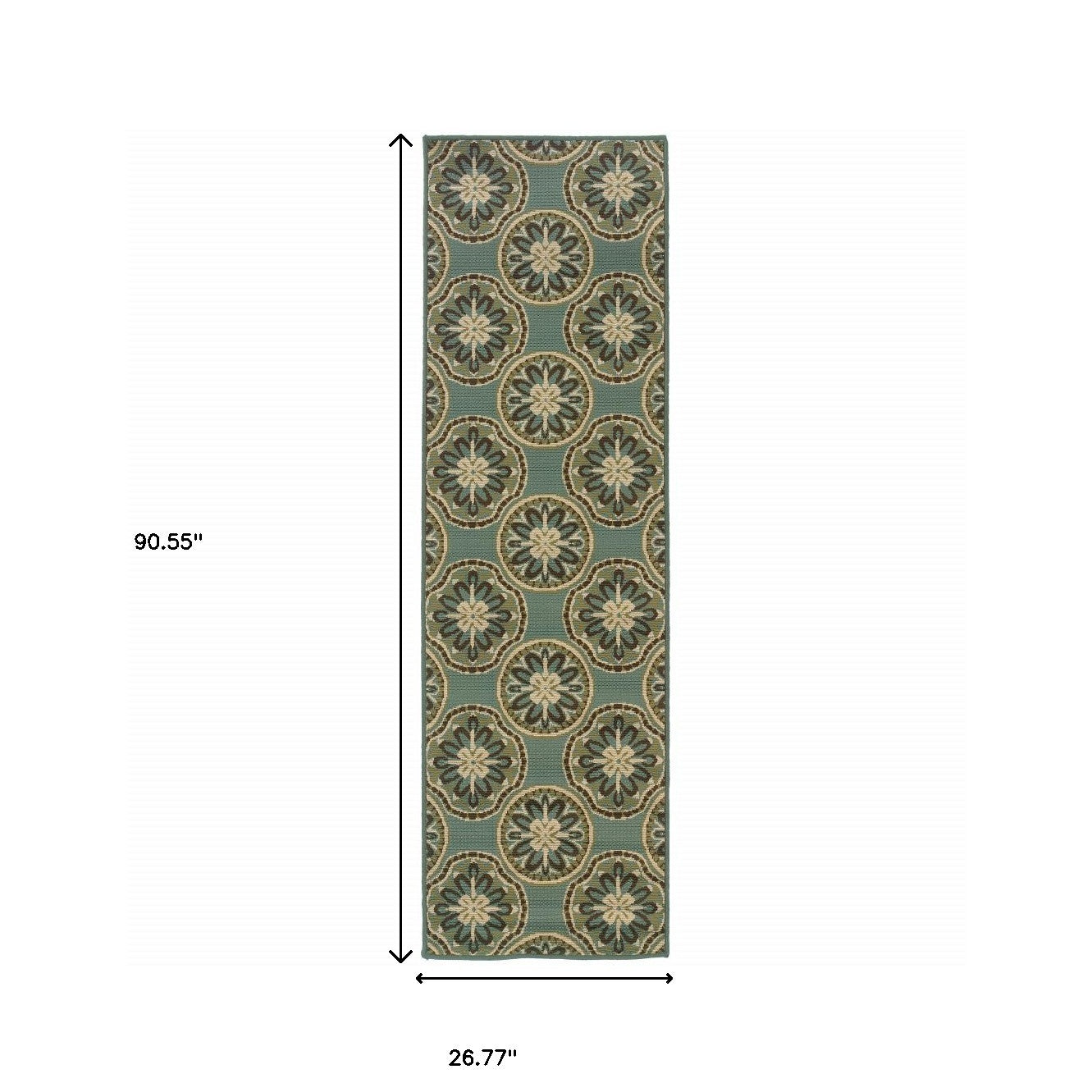 2' X 8' Blue and Ivory Floral Stain Resistant Indoor Outdoor Area Rug