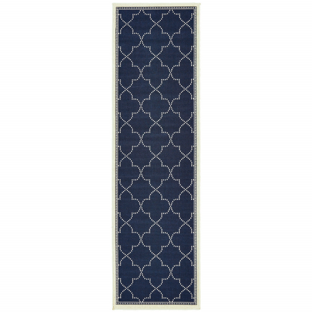 2' X 8' Blue and Ivory Geometric Stain Resistant Indoor Outdoor Area Rug