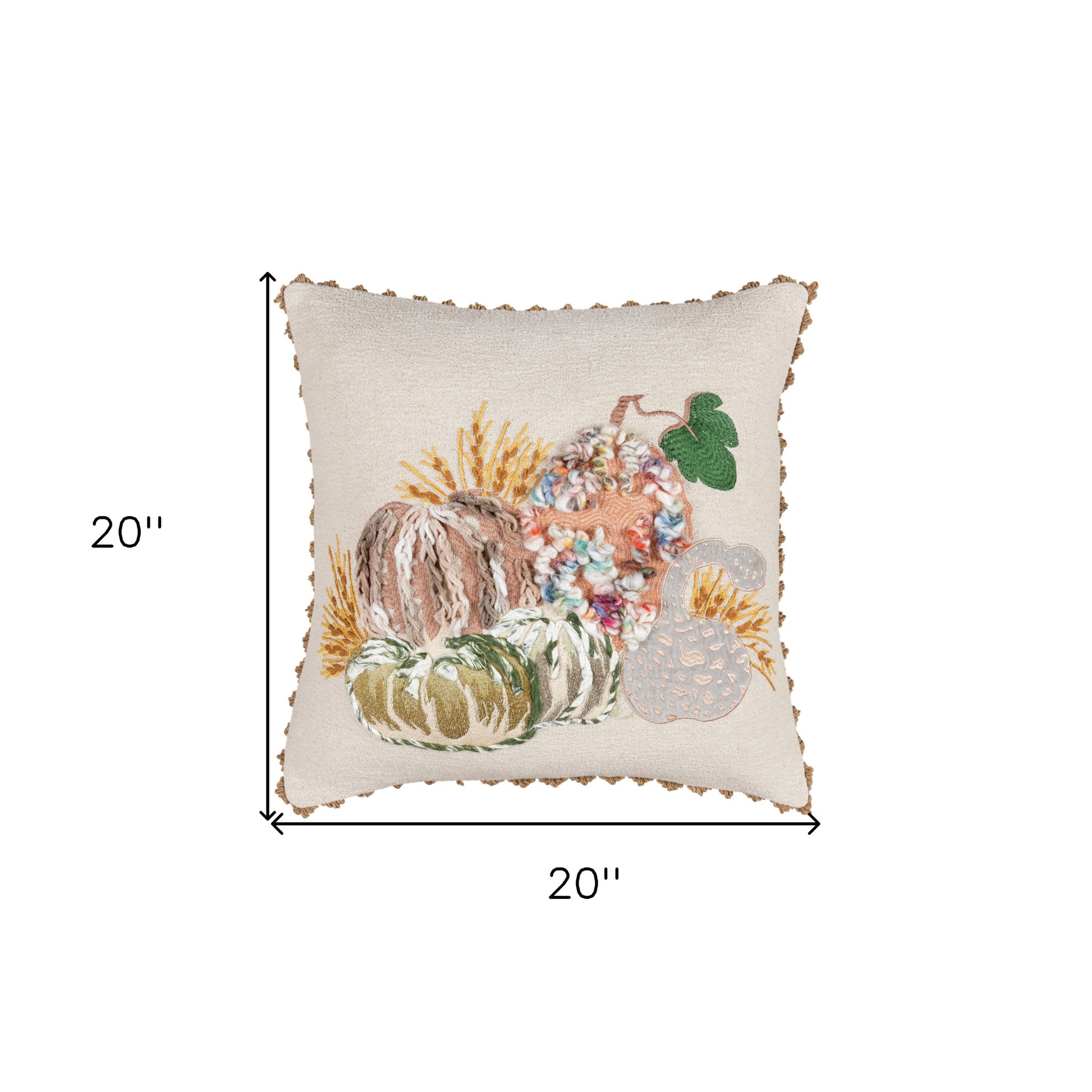 20" Beige and Green Thanksgiving Cotton Pillow With Applique, Embroidery Edges