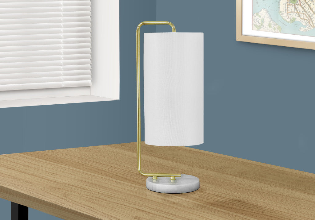 Add a bright anchor to your room with this 20-inch gold and white marble round arched table lamp with ivory drum shade. The base of this lamp is made of white marble with a gold body. The ivory drum linen shade is a great compliment to this lamp. A sophisticated take on a classic, this arched table lamp is a great option for a unique look. High quality design makes this a great lamp for not only lighting, but accenting a room with style. The perfect lamp to create just the right natural and soothing light in your space. 20-inch H x 8-inch W x 8-inch D