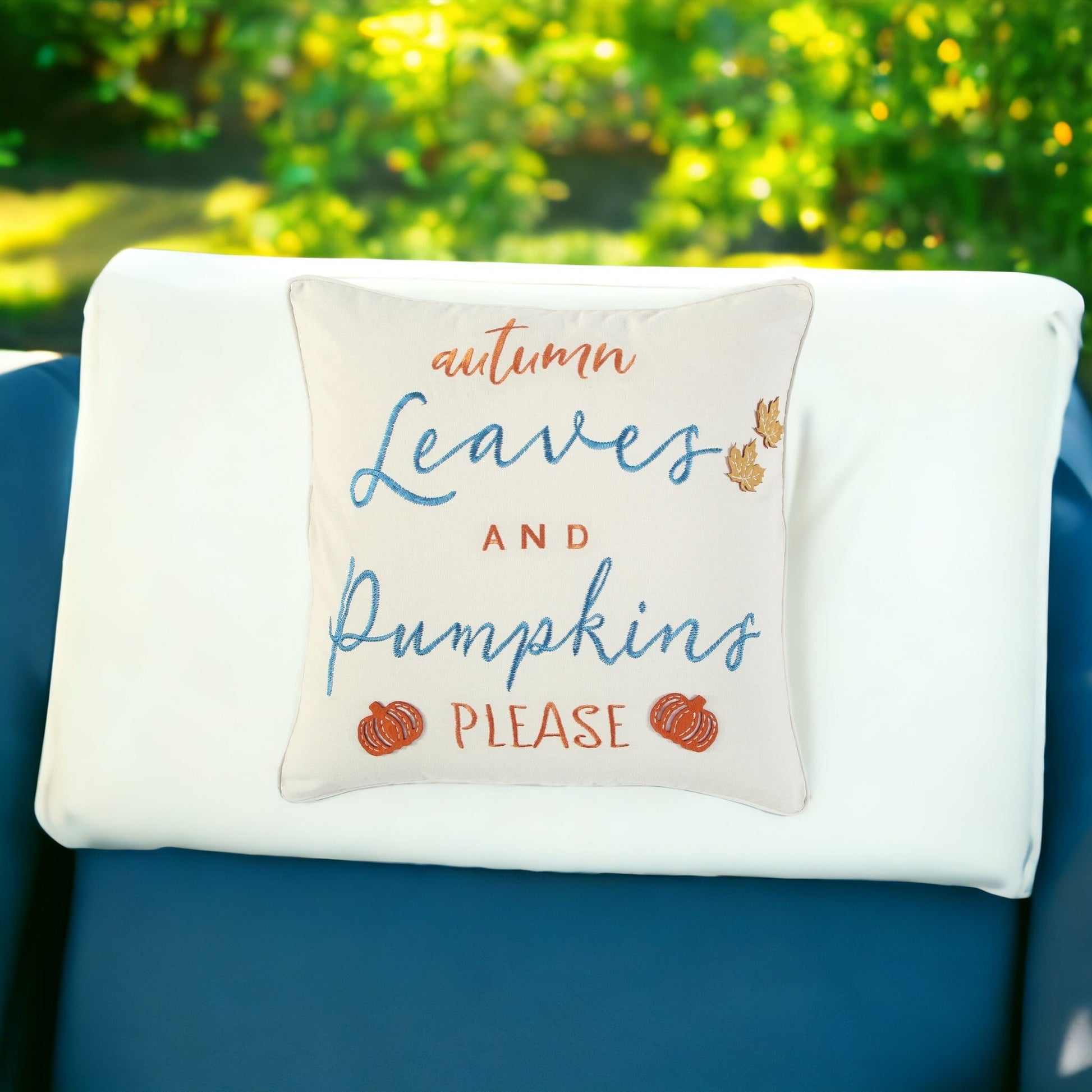 Set a festive fall mood with this cozy and fun 20-inch ivory blue and orange thanksgiving cotton pillow with applique, embroidery edges. This ivory blue and orange hued piece represents quality construction, expertly made from premium 100% cotton that is not only long lasting but super soft to the touch as well. This soft polyester pillow not only is decorative but made to be comfy and cozy all day long. Emblazoned with the text autumn leaves and pumpkin please this pillow adds some visual interest and decor to your space. Decorative throw pillows not only add color and dimension to your space but can be comfy and supportive when you are lounging and cuddling as well. Decorative pillows are a great way to change up the look and feel of your space easily and quickly. 20-inch H x 20-inch W x 6.25-inch D