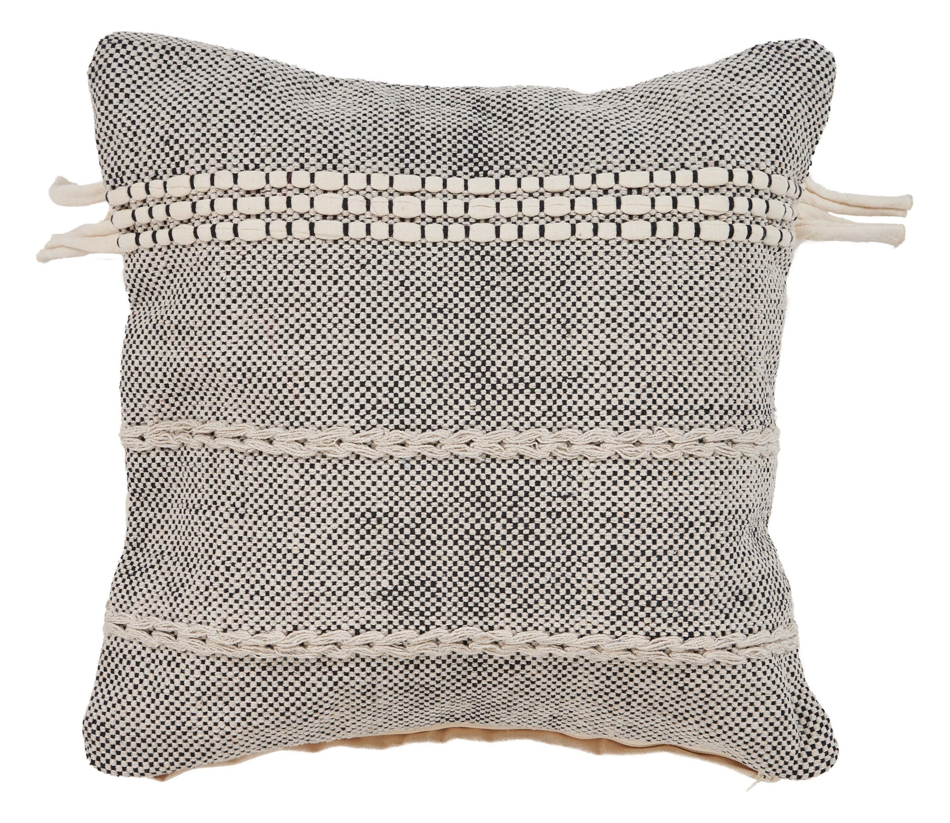 Unique and decorative, this comfortable 20" x 20" black and off-white 100% cotton striped zippered pillow will leave a lasting impression. This super soft decorative pillow is expertly made of high grade, long lasting 100% cotton in a black and off-white coloration. Great to use on its own or mix with other decorations for the perfect look. A great decorative accessory for your favorite chair, to accent your sofa, or to use as part of your bed ensemble. 4" H x 20" W x 20" D