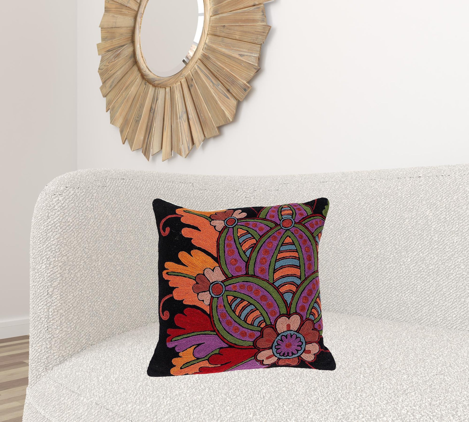 20" X 20" Black And Orange Zippered 100% Cotton Throw Pillow With Embroidery