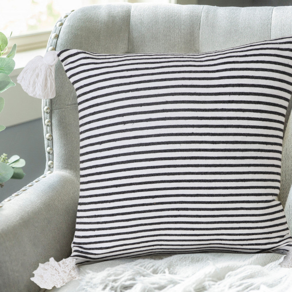 20" X 20" Black And White 100% Cotton Striped Zippered Pillow