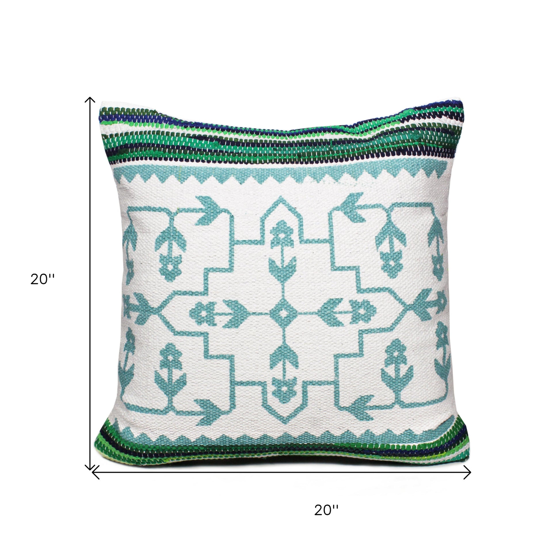20" X 20" Green White And Blue 100% Cotton Geometric Zippered Pillow