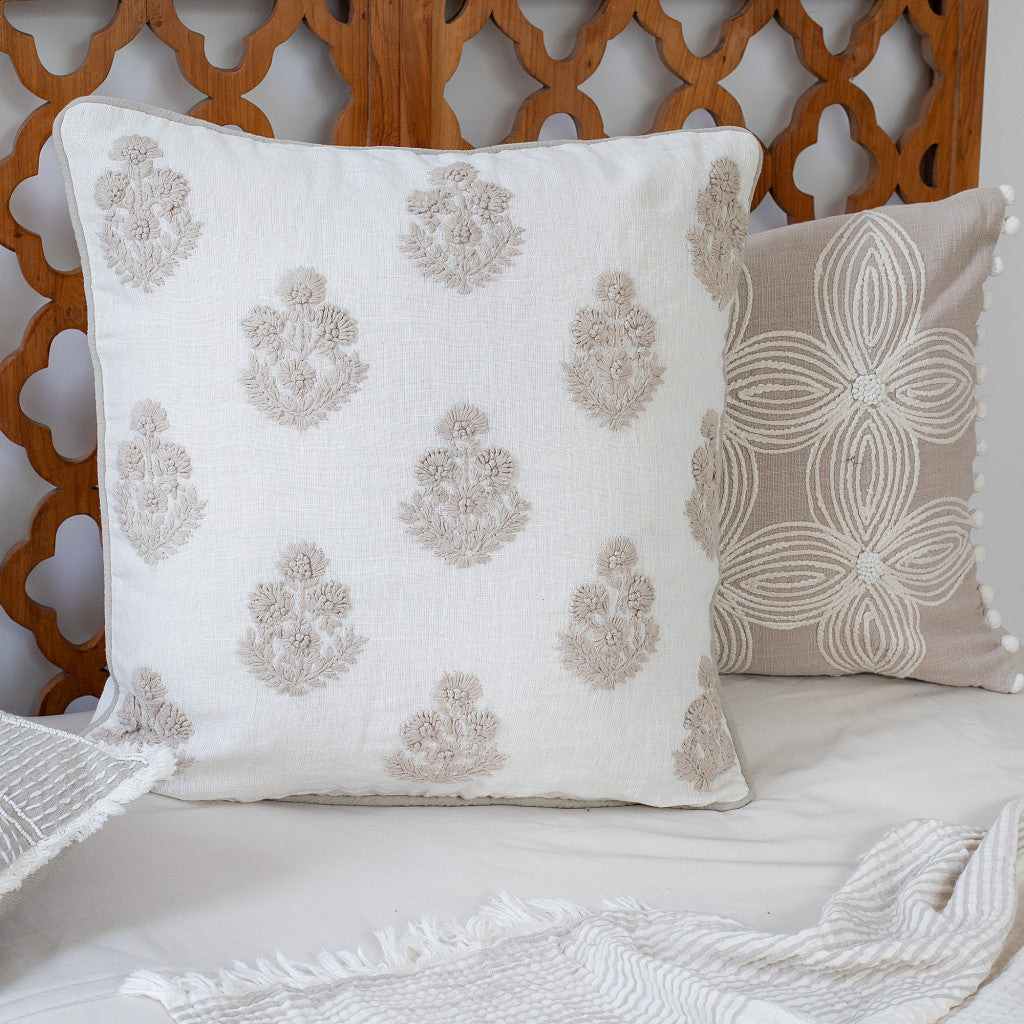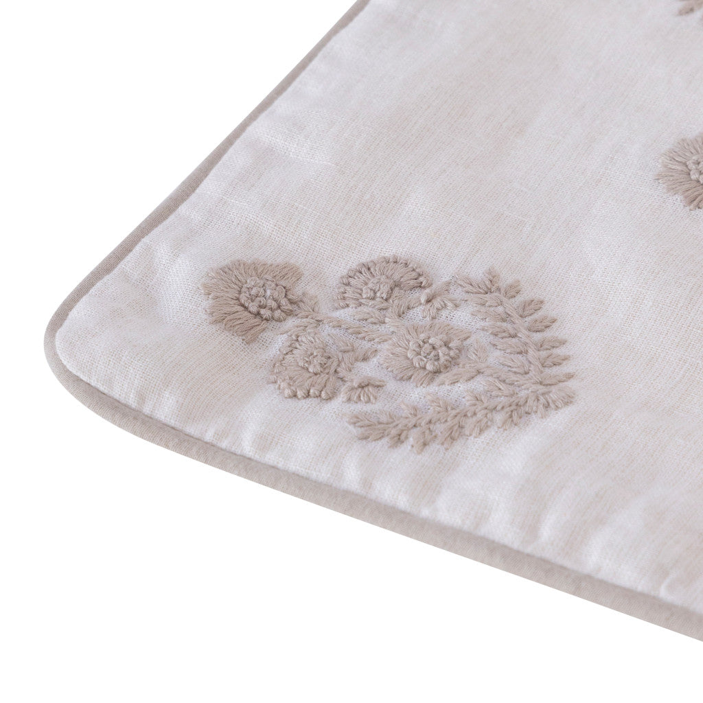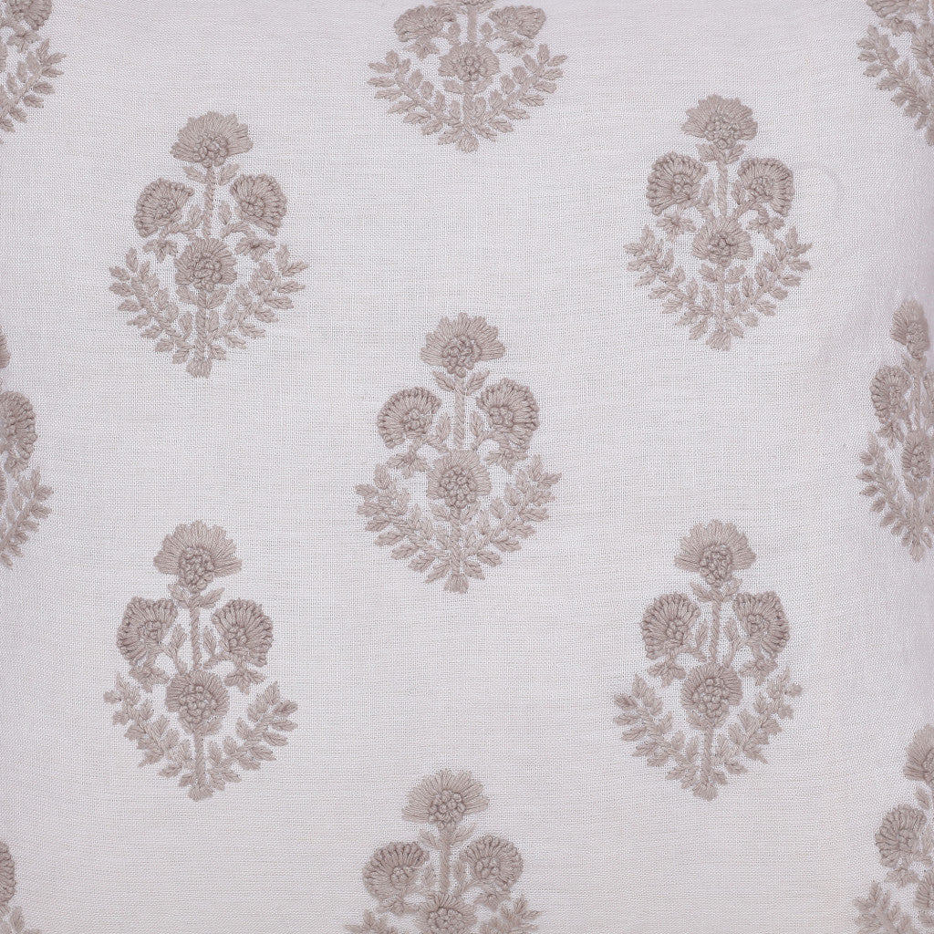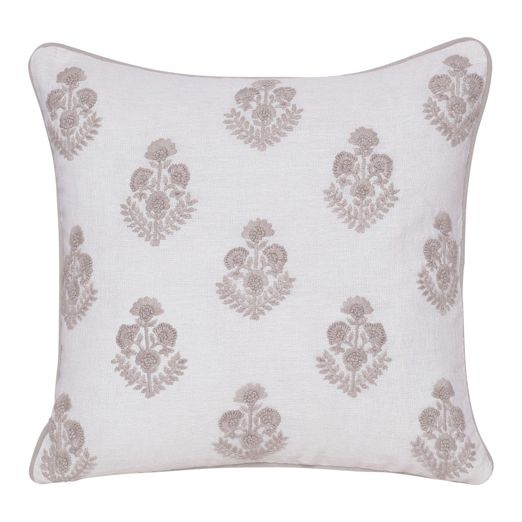 20" X 20" Natural and Ivory Floral Linen Zippered Pillow With Embroidery