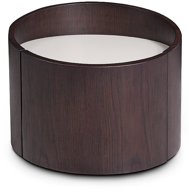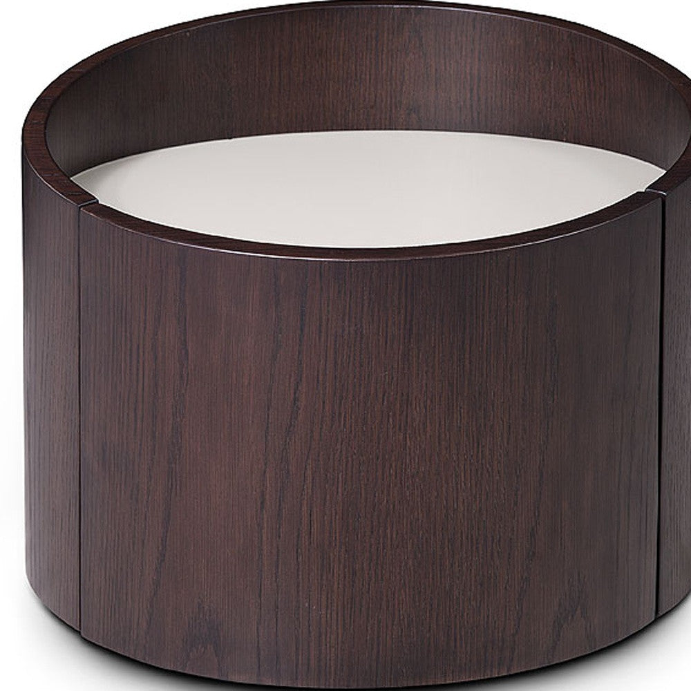 The  21" Round Modern Brown Oak Finish End or Side Table is truly unique and stunning. This table  features a sleek, smooth design with a unique sunken grey gloss finish top. Excellently crafted, this modern design can be a nightstand, end table, side table, or small coffee table. Measuring 17" x 21" x 21" this table presents  sturdy and unique design and construction that will completely transform your living space with its contemporary style.