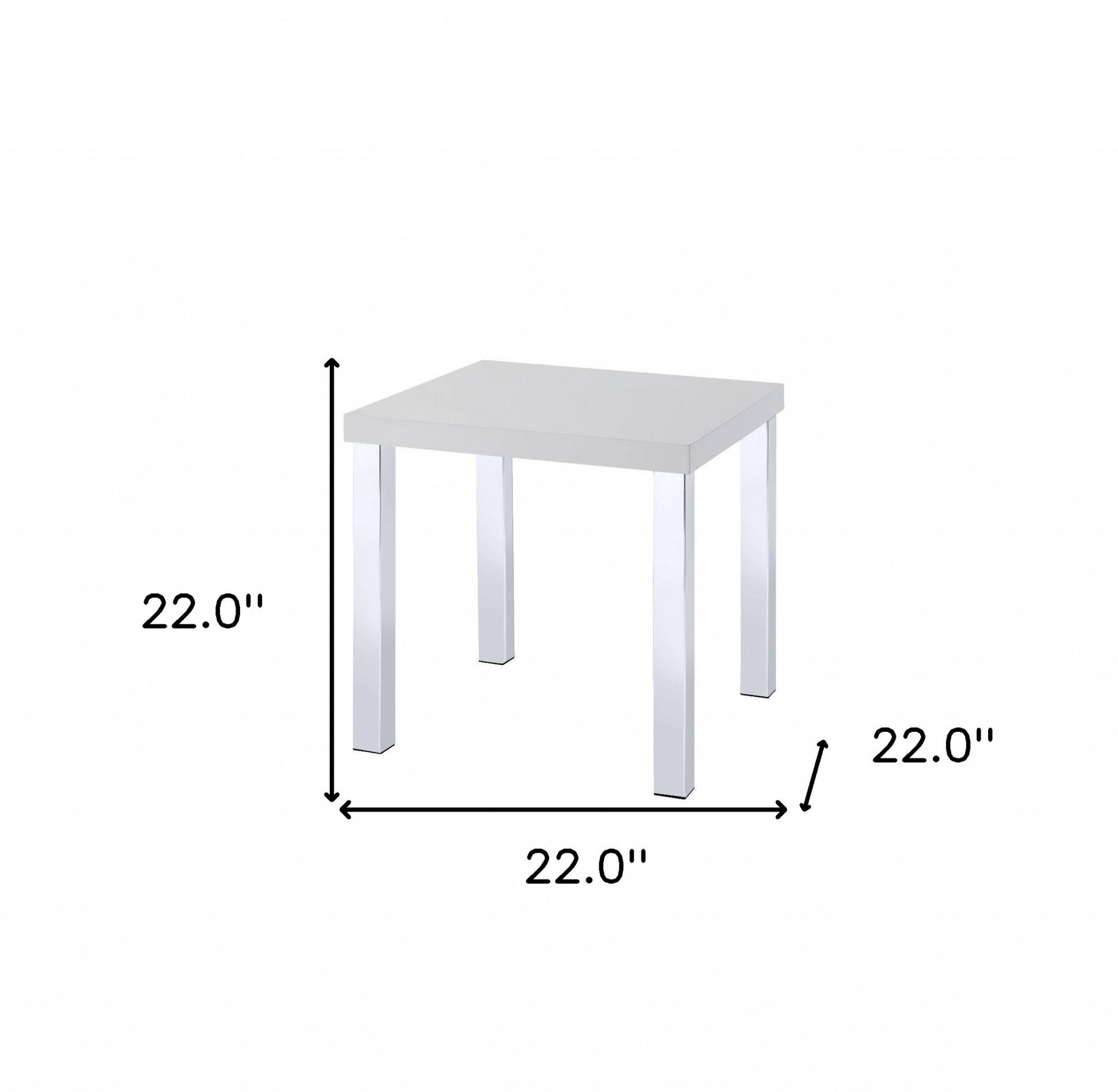 Show off your exquisite taste with this 22" chrome and white high gloss square end table. Quality construction from the chrome metal base combines with white high gloss manufactured wood of the top to give this table a fresh and updated look. Sleek lines make this table a stand out. Side tables are a great way to flank your sofa, use as an accent next to your favorite chair, or can even be used bedside. You can also use it as an entryway table to hold your keys. 22" H x 22" W x 22" D