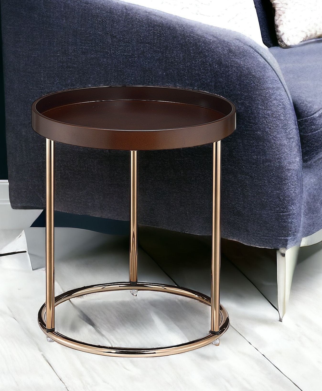 Optimize your space and add some charm to your room with the 22" copper and brown solid wood and steel round end table. The copper coloration of the high quality steel base marries nicely with the brown solid wood top. The lip around the tabletop edge is great for keeping everything neat and tidy. A great accent on either side of the sofa or bed, this adorable end or side table is just what you need. You can match it with other pieces to get the ideal look for your place. 21.75" H x 18.5" W x 18.5" D