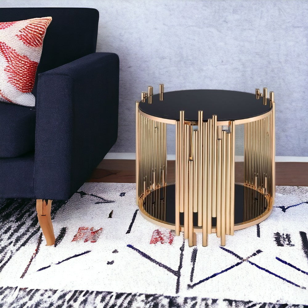 22" Gold And Black Glass Round End Table With Shelf