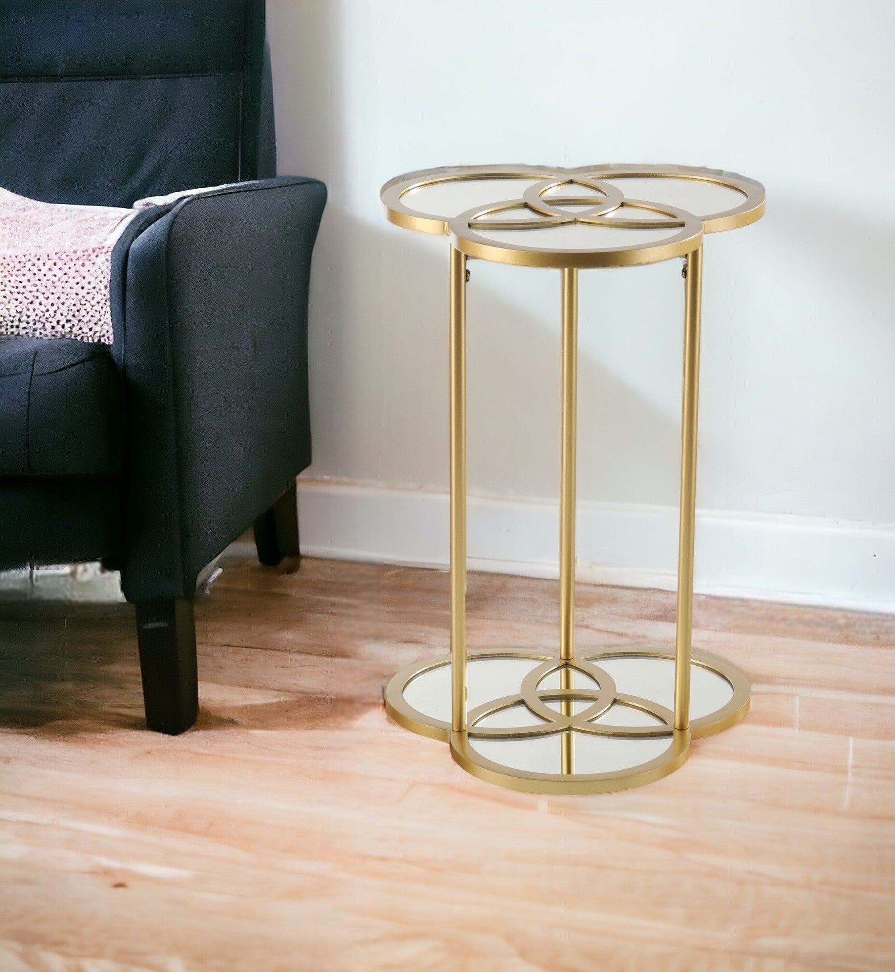 Optimize your space and add some charm to your room with the 22" gold mirrored glass three circle end table. The base of this table is made from iron in a gold color that is a nice contrast to the clear glass tabletop. An ideal location for placing your snacks and drinks, and a place to keep your lamp, frames, or other accessories. You can match it with other pieces to get the ideal look for your place. 22" H x 15.25" W x 15.25" D