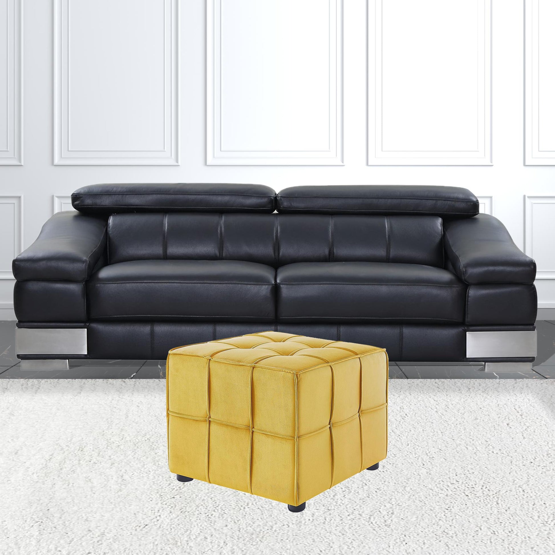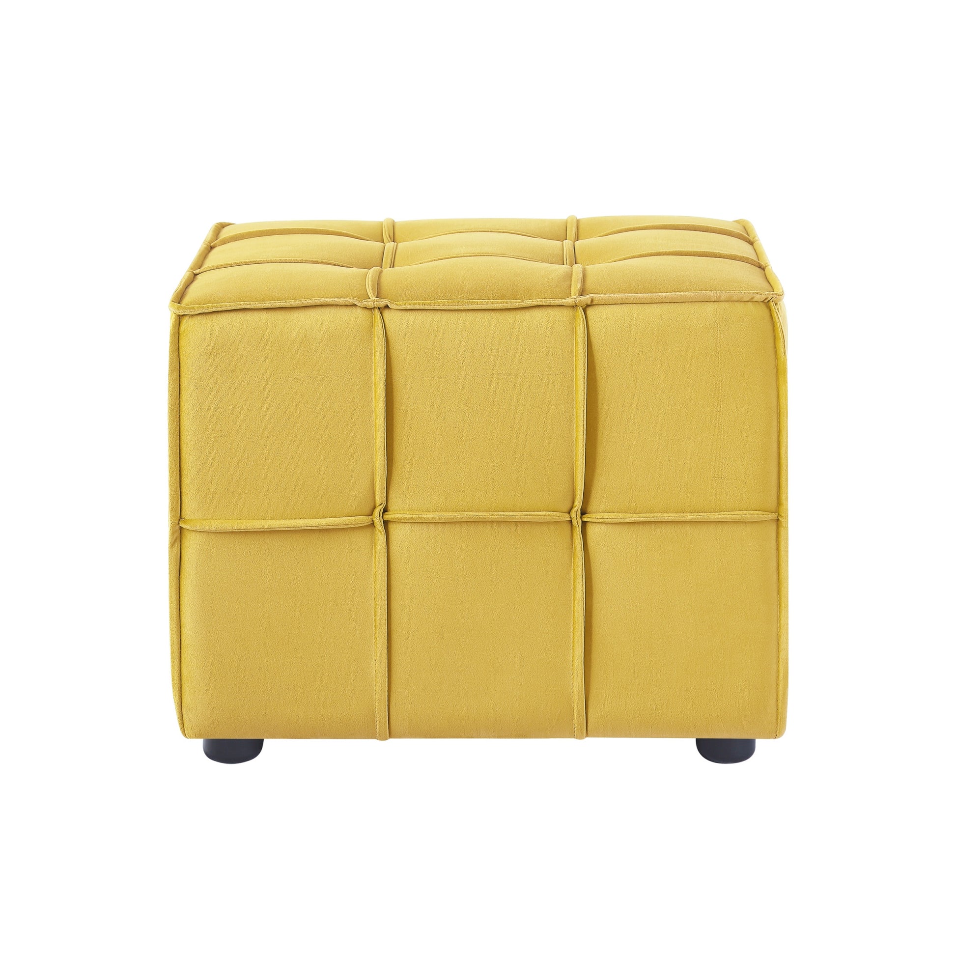 Optimize your space and add some charm to your room with the 22" yellow velvet and black cube ottoman. Add chic style to your space with this fun cube that not only looks cool but can be a great foot rest or extra seat when needed. The yellow manufactured wood top of this ottoman is a nice contrast to the black leg coloration of the base. Expertly upholstered with padding in a soft solid color velvet, this ottoman is as comfortable as it is good looking. Ottomans are multi-functional additions to your space that add fashion and practical value. 18" H x 22" W x 22" D