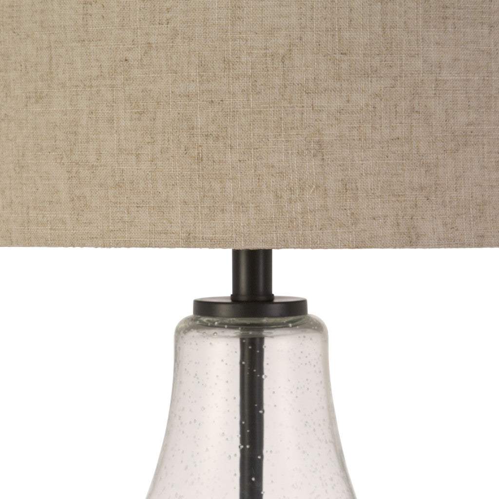 Bring of level of elegance and freshness to your space with this high quality 23-inch black glass table lamp with flax drum shade. The lamp is made of sturdy glass and features a black color. Includes a flax fabric, drum shaped shade, making this a fashionable piece that will complement most any interior. This standard table lamp is designed to provide general lighting to the area. Use this lamp anywhere and elevate the look of the whole space. It is perfect for virtually any decor. 23-inch H x 15-inch W x 15-inch D